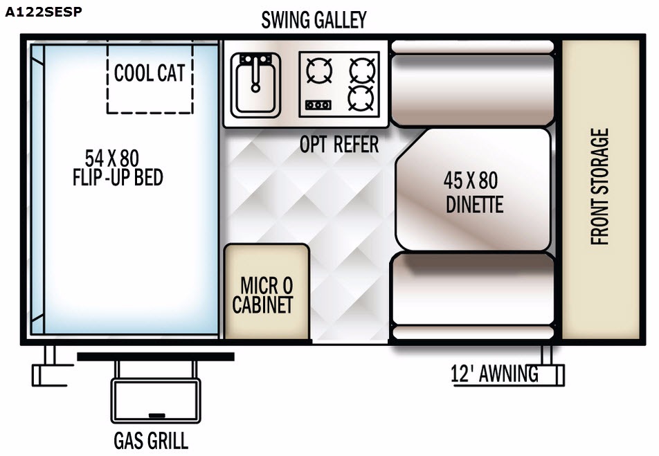 When it's time to make meals there is a three burner range, single sink, and optional refrigerator on a swing galley along the road side. On the opposite side, you will find a microwave inside a cabinet allowing you to heat up your leftovers.