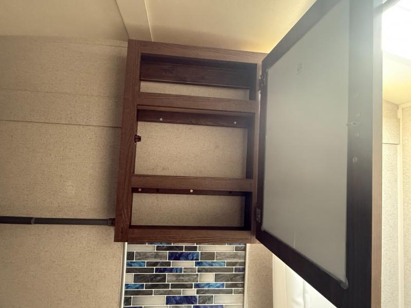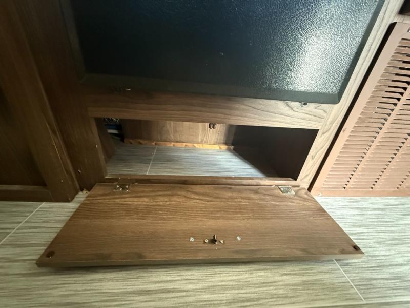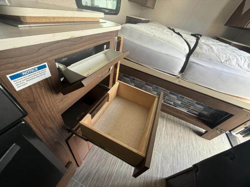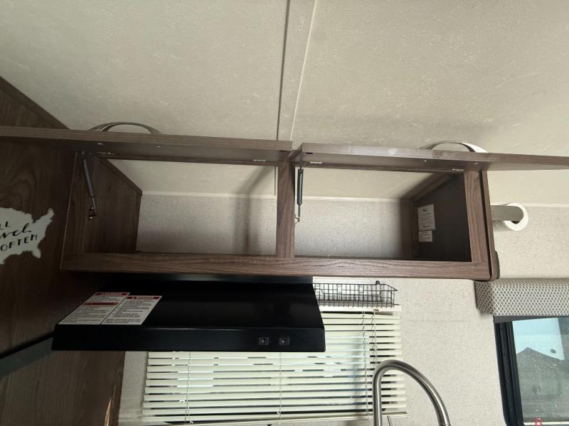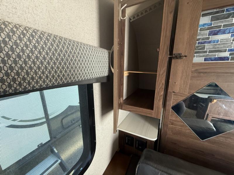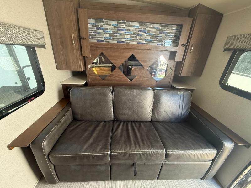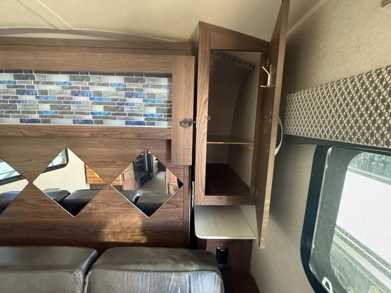 Along the front of the travel trailer, you will find a find a 73" sofa where you can sit and plan out your day, and at night, just pull down the Murphy bed and you instantly have your sleeping area. Along either side of the bed there are wardrobes for your clothes.