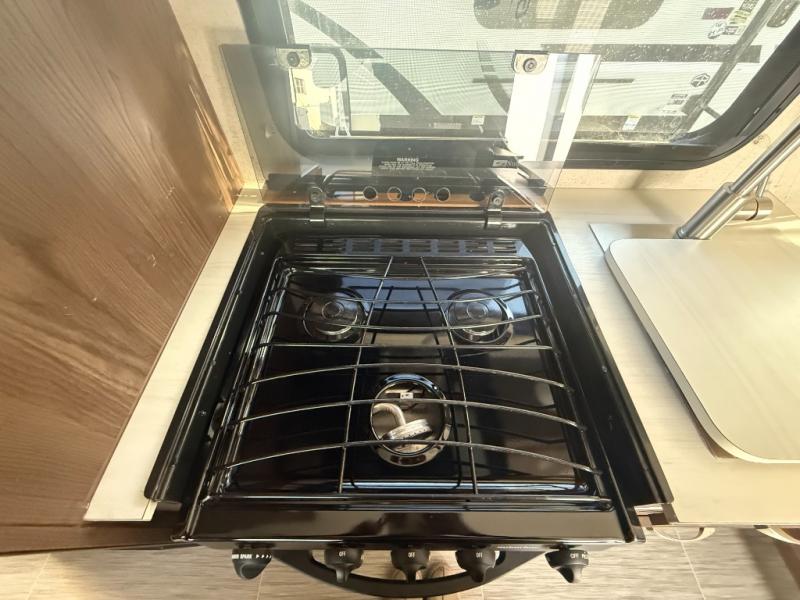 The kitchen area features a flip up counter, a sink, a three burner range, and a refrigerator, plus a microwave.