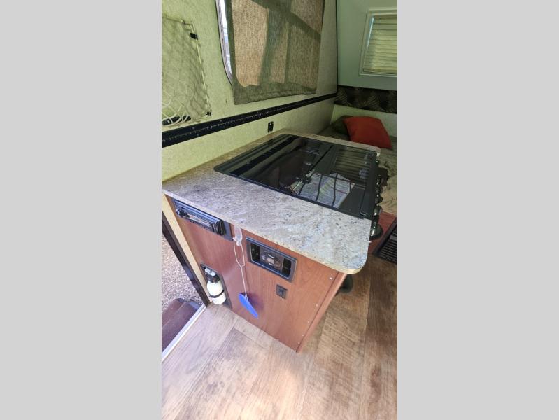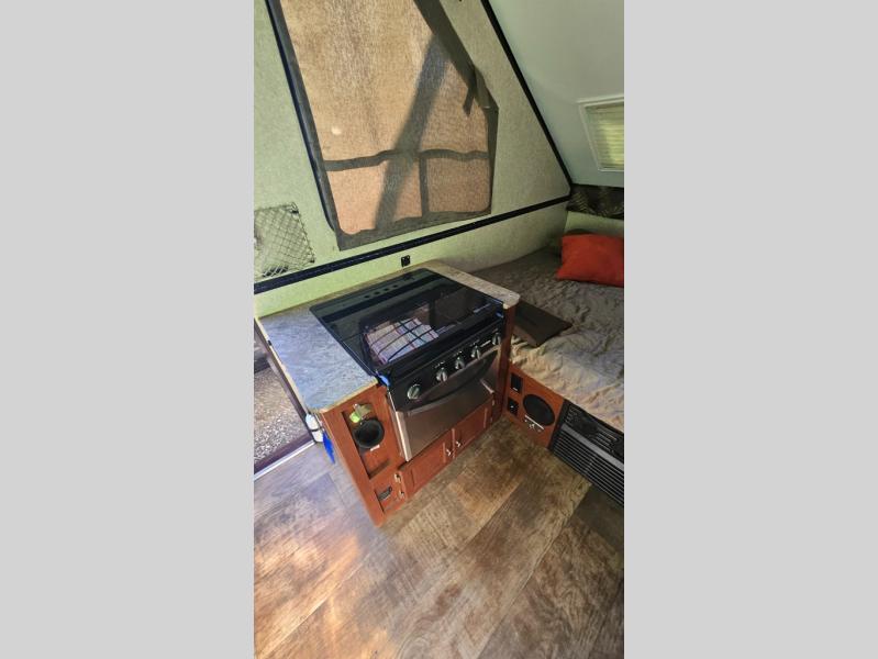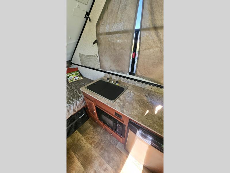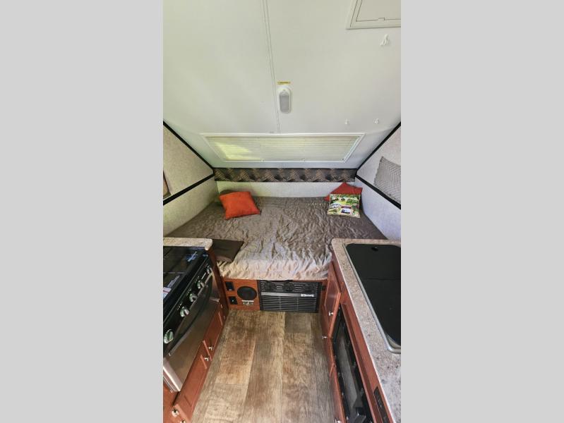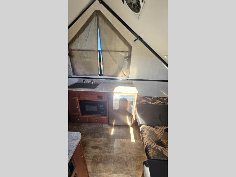 As you enter this Rockwood Hard Side High Wall Series A212HW folding pop-up camper by Forest River, you will find that there is a 50" x 80" front booth dinette. The dinette folds down to provide sleeping space for TWO if you like.