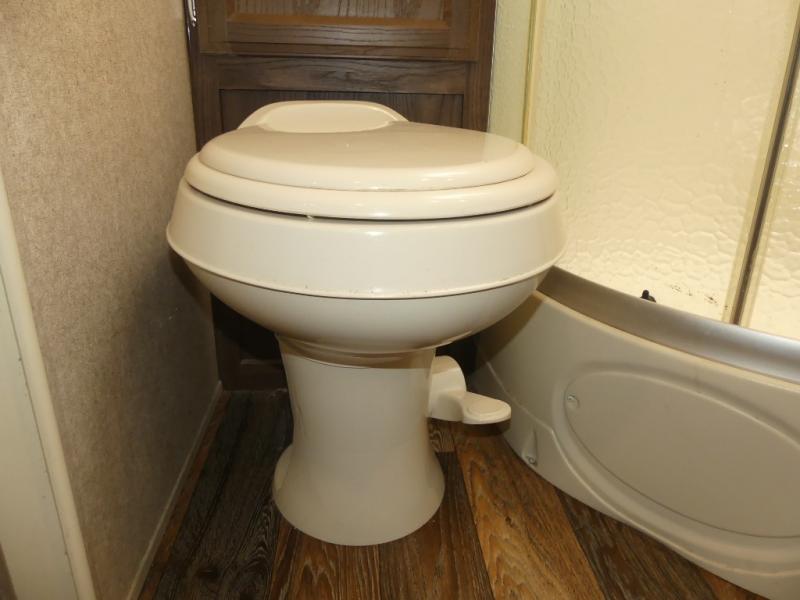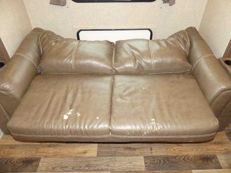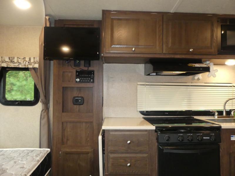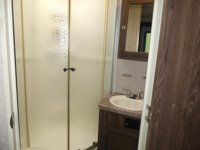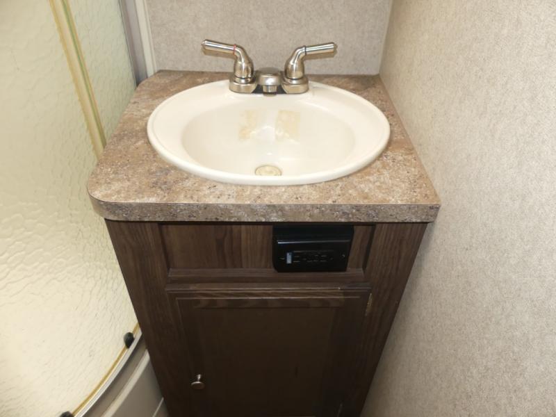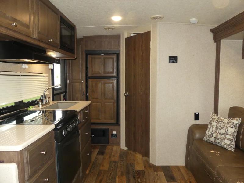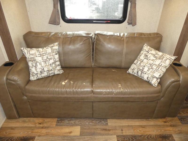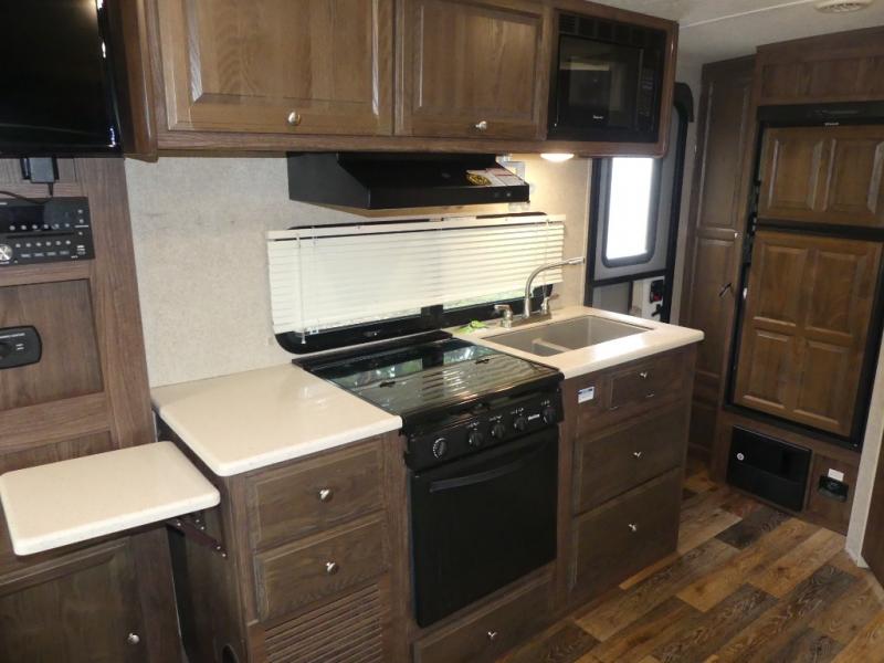 You can relax or dine at the sofa slide out along the road side wall. There is a 55" x 18" table and cup holders for convenience as well. The opposite side of the travel trailer has a counter space, double kitchen sink, three burner range, microwave, and a countertop extension. You will also find an entertainment center for your inside enjoyment.