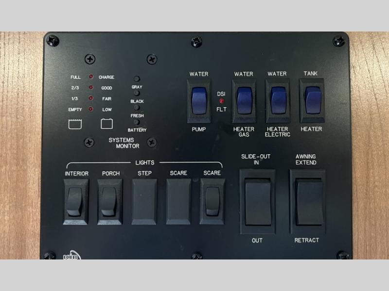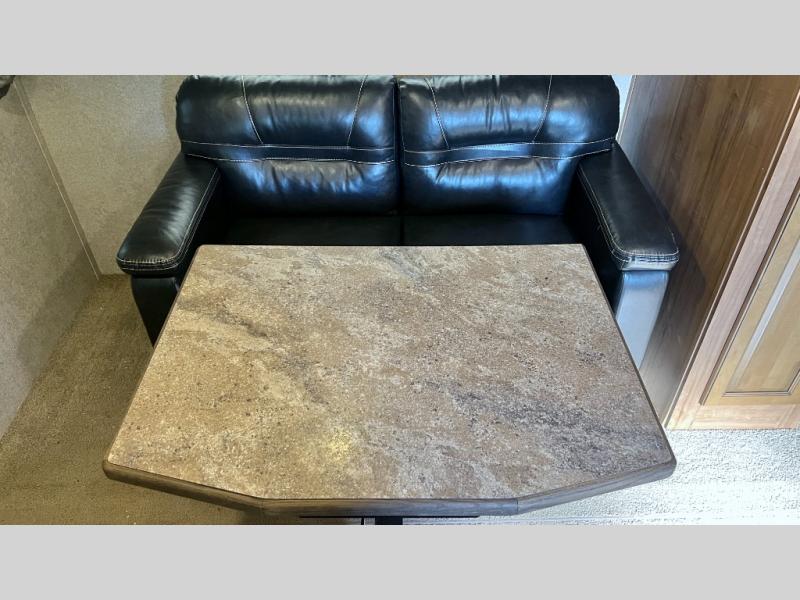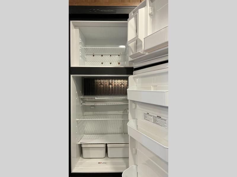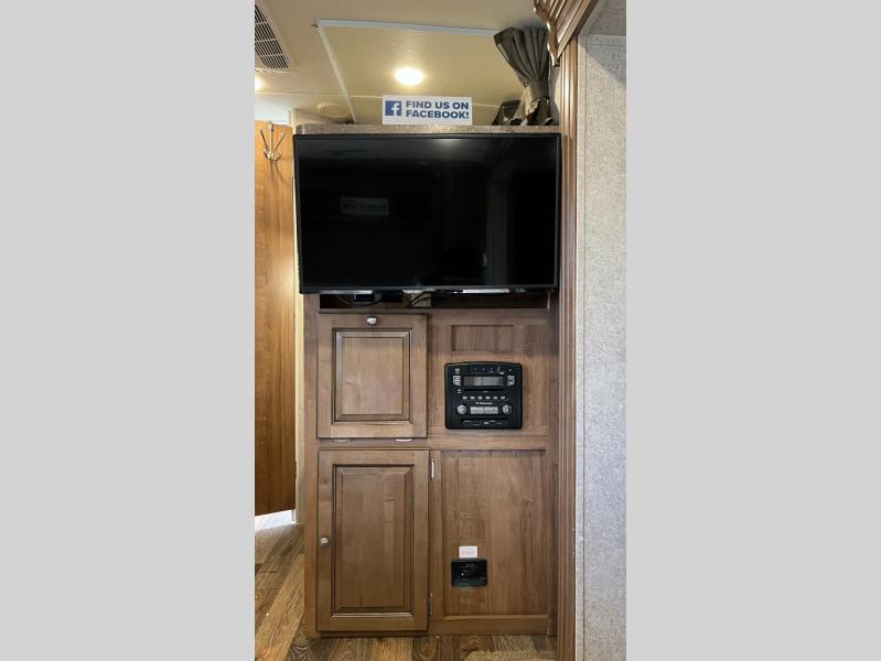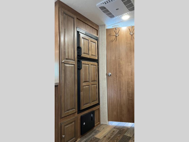 The curb side kitchen area offers a countertop extension, double kitchen sink, three burner range, microwave, pantry, and a refrigerator. A single slide with a wardrobe and a tri-fold sofa are on the opposite side. Adjacent to the slide there is an entertainment center for your enjoyment.