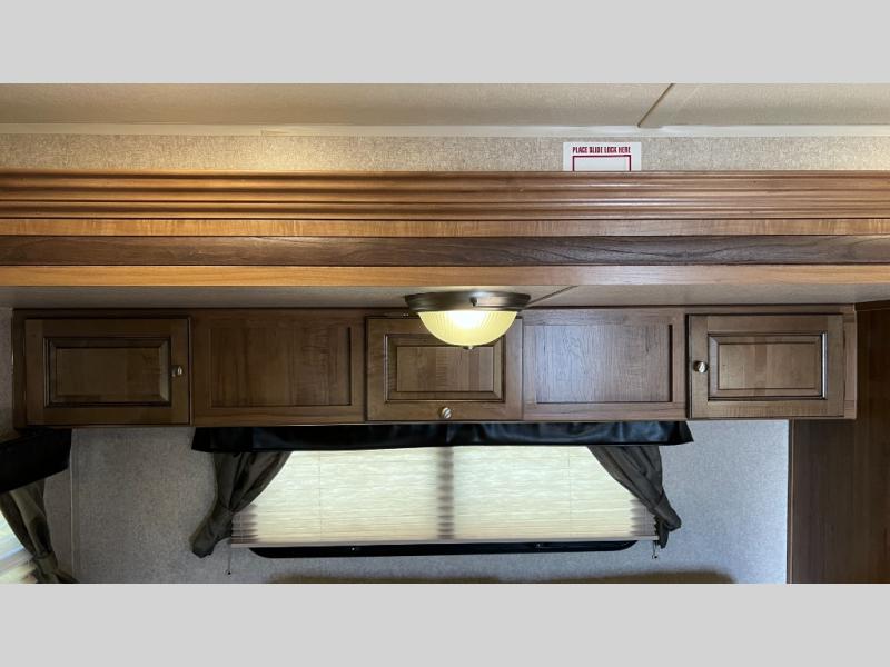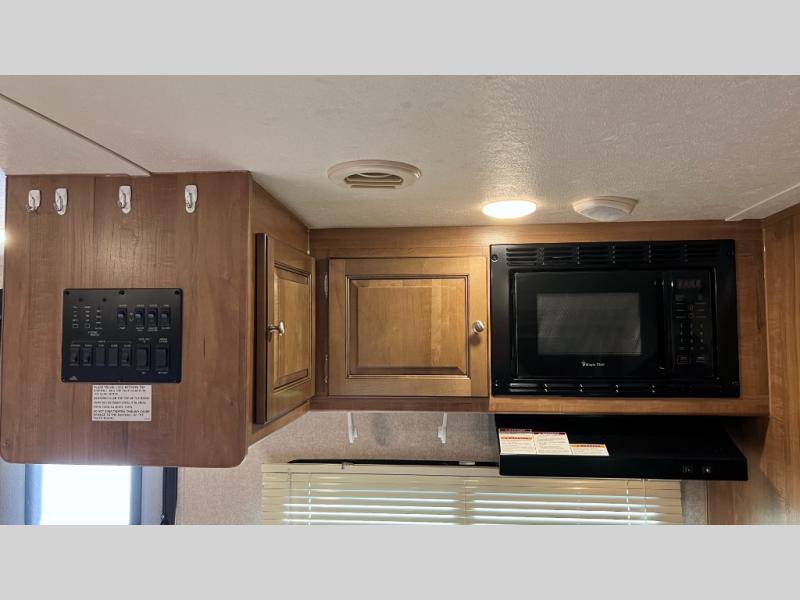 If you enjoy the extra sleeping space provided by a set of bunk beds, the seating provided by a tri-fold sofa, and the convenience of a jackknife sofa and Murphy bed combination then step inside this single slide out Rockwood Mini Lite travel trailer.