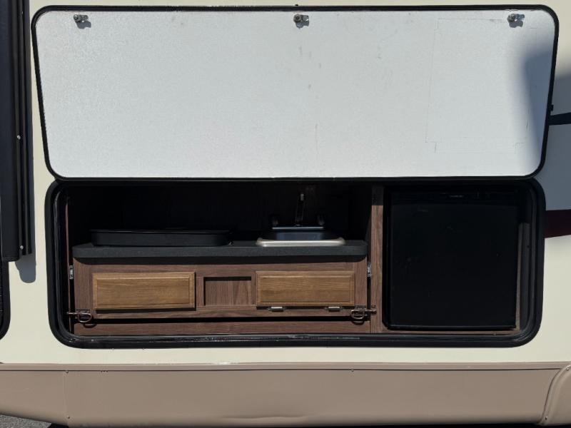 Exterior pull-out kitchen: 2-burner cooktop and sink, plus refrigerator.