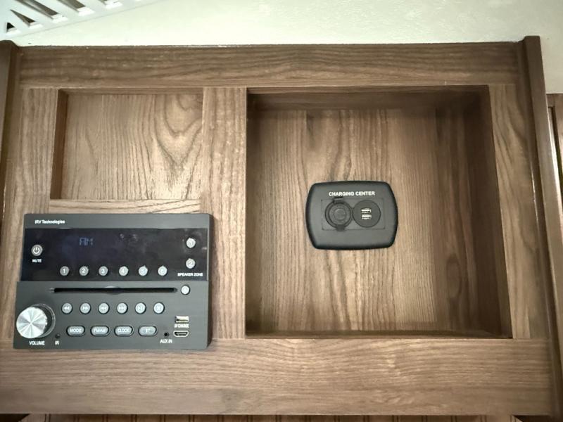 Entertainment center on the outer bathroom wall, viewable from the kitchen/dinette area.