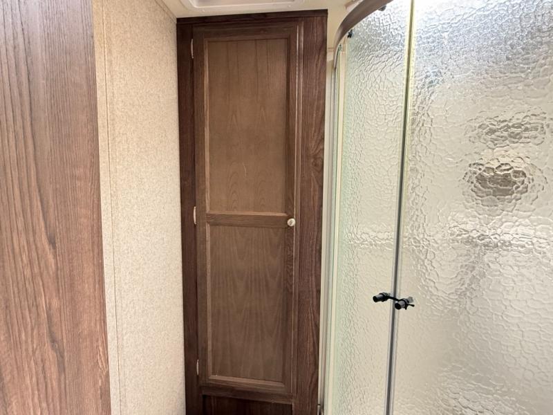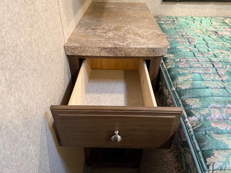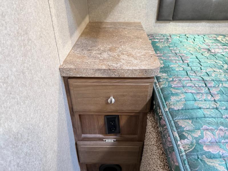 Rear bedroom with queen bed, flip-up storage, nightstands, wardrobes along one side, corner cabinet on the other.