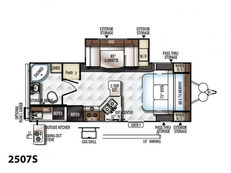 Outside you will find plenty of exterior storage compartments, plus a 19' awning. You can even choose to add an optional rear ladder.
