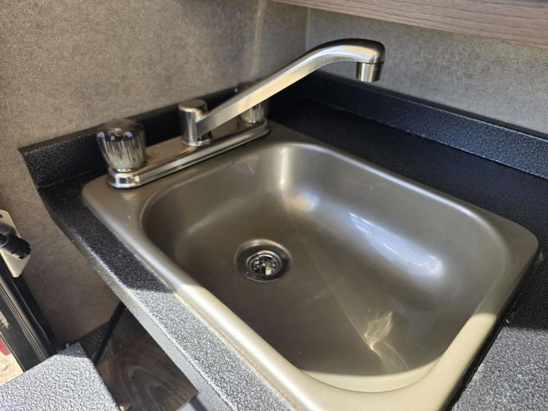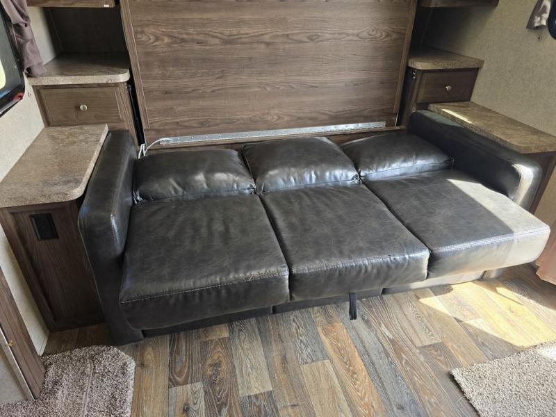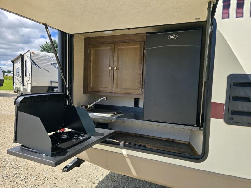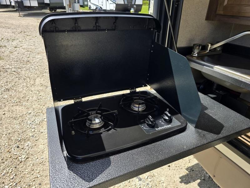 Before you check out the inside of this model, take a peek at the outside kitchen. Here you will find a sink, an overhead cabinet, a refrigerator, a two burner swing-out cooktop, and a gas grill. Now you can spend more time outdoors with your family, while still being able to fix meals throughout the day.