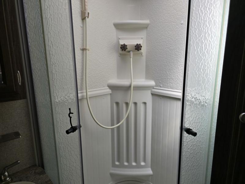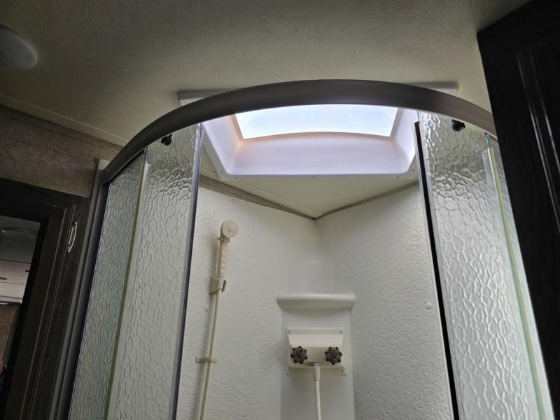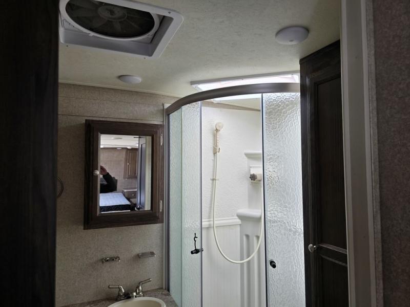 The rear bathroom features a linen cabinet, a radius shower, a sink with a medicine cabinet above, more storage, and a toilet.