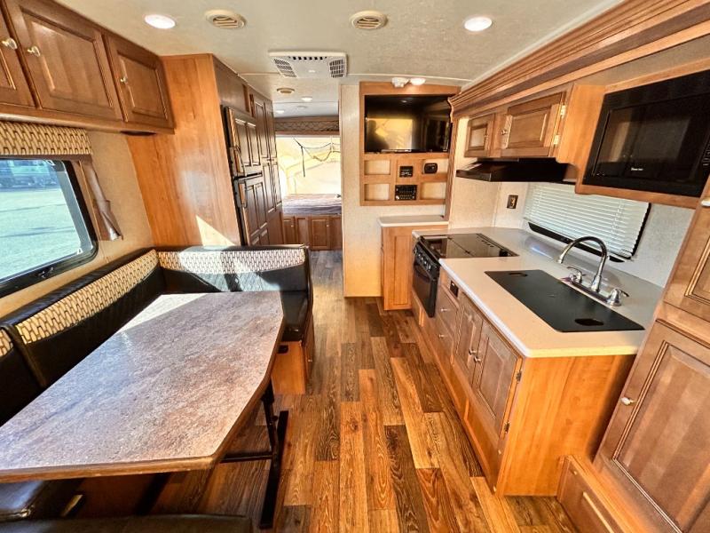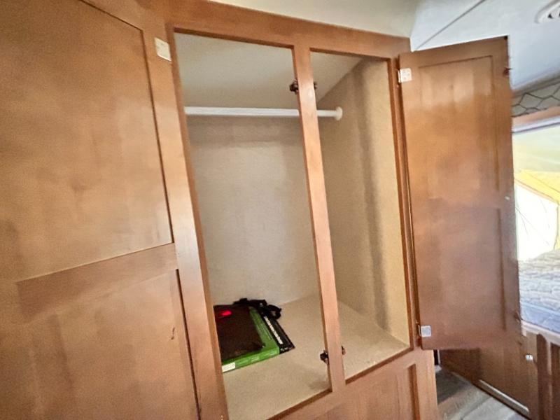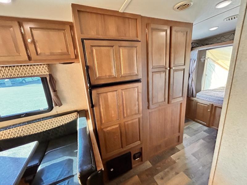 On the opposite side you will find an 85" u-shaped dinette with overhead cabinets, a refrigerator, and a large wardrobe.