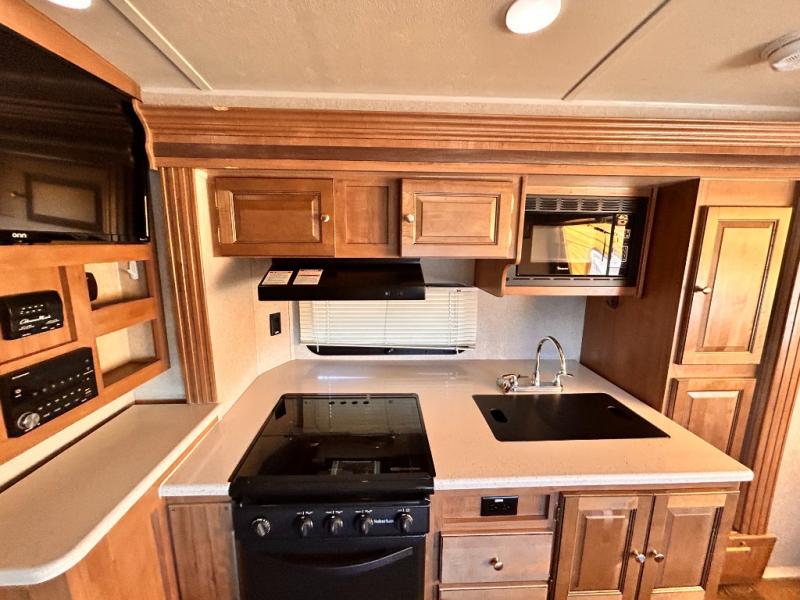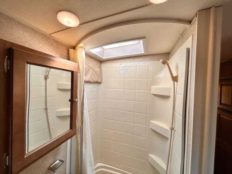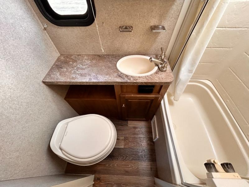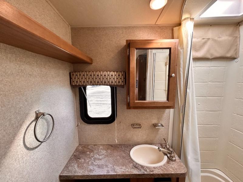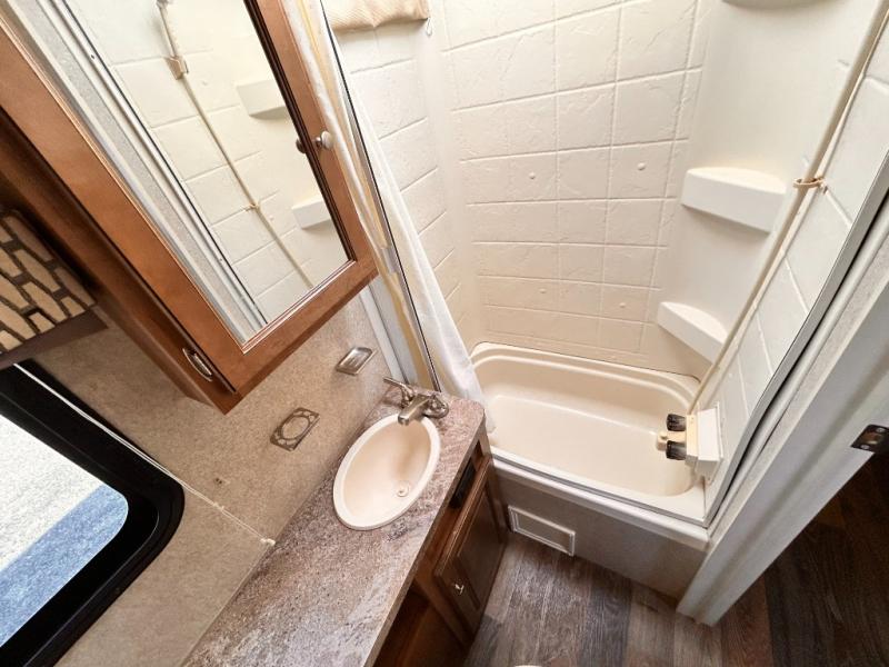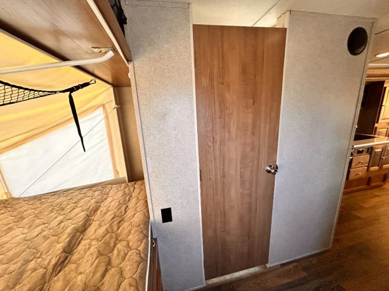 Front and rear queen tent end beds feature a shelf above for storage. As you enter, a bathroom is directly in front of you. The rear corner bath features a toilet with shelf above, vanity sink, medicine cabinet, and a tub. Continuing around there is an entertainment center and the single slide which has a three burner range, double kitchen sink, overhead cabinets and microwave, plus a pantry.