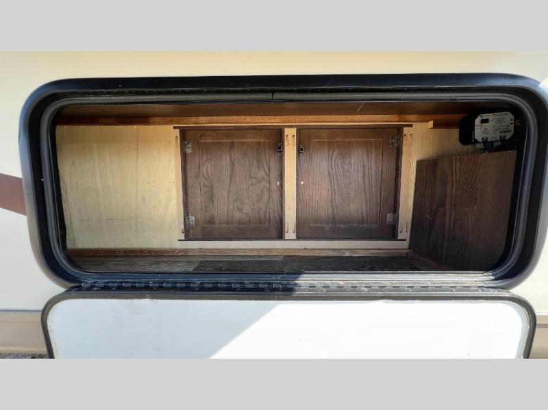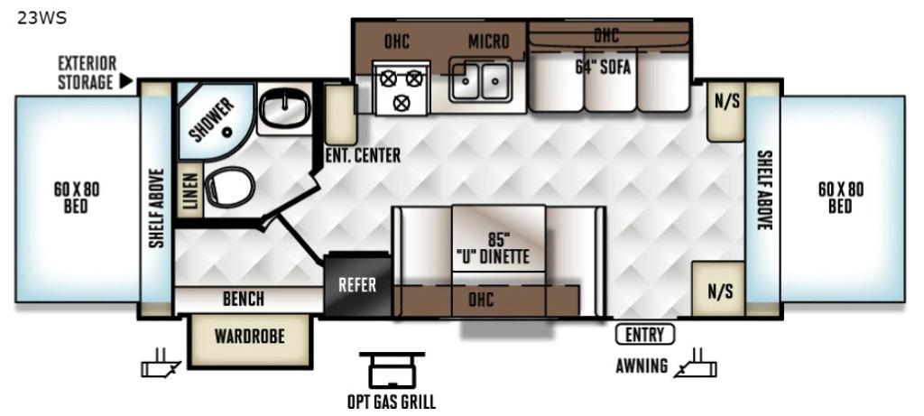 The outside features an awning and exterior storage. An optional gas grill may be added as well.