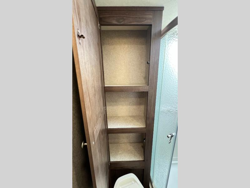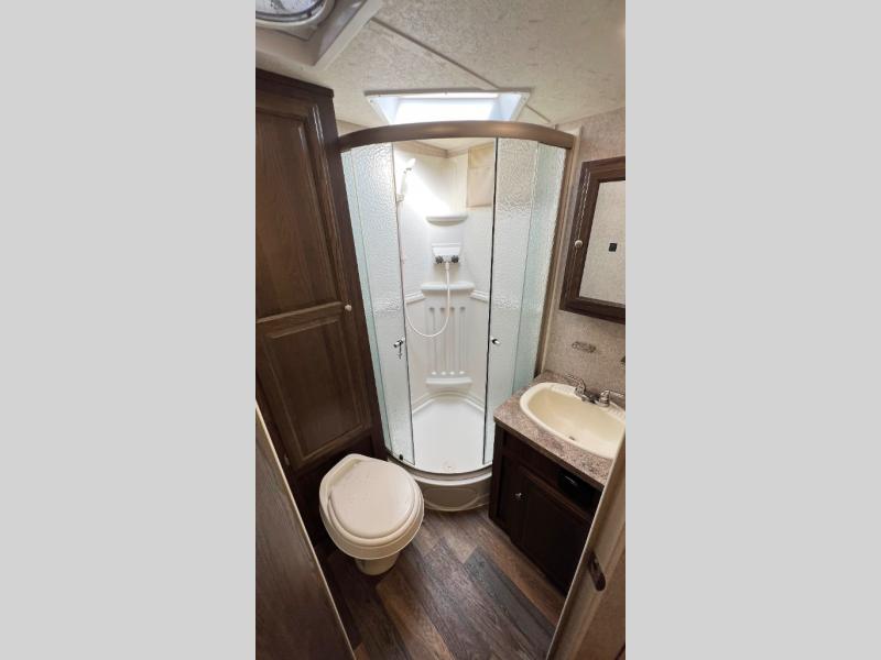 A corner bathroom features a vanity sink, medicine cabinet, corner shower, linen storage, and a toilet. The second queen tent end bed is located in the rear of the trailer with an upper storage shelf. There is a wardrobe slide and bench seat next to this bed as well as a door for privacy.