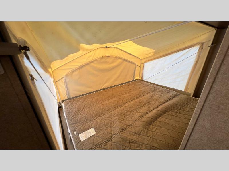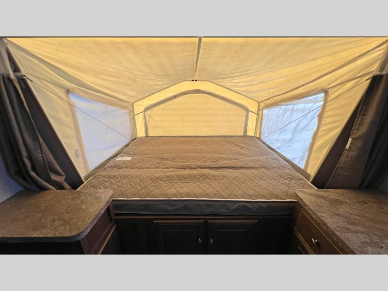 Step inside to your right to the front tent end bed including two nightstands and a shelf above for storage.