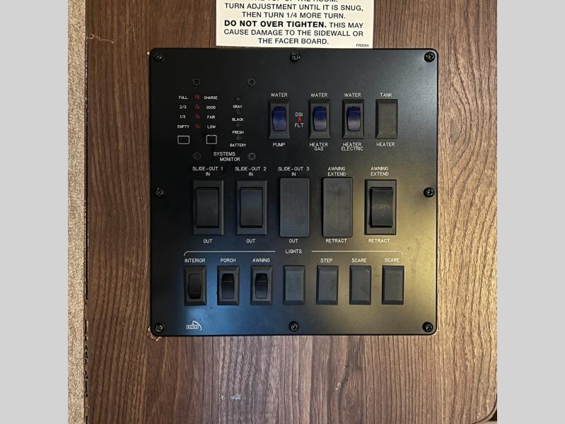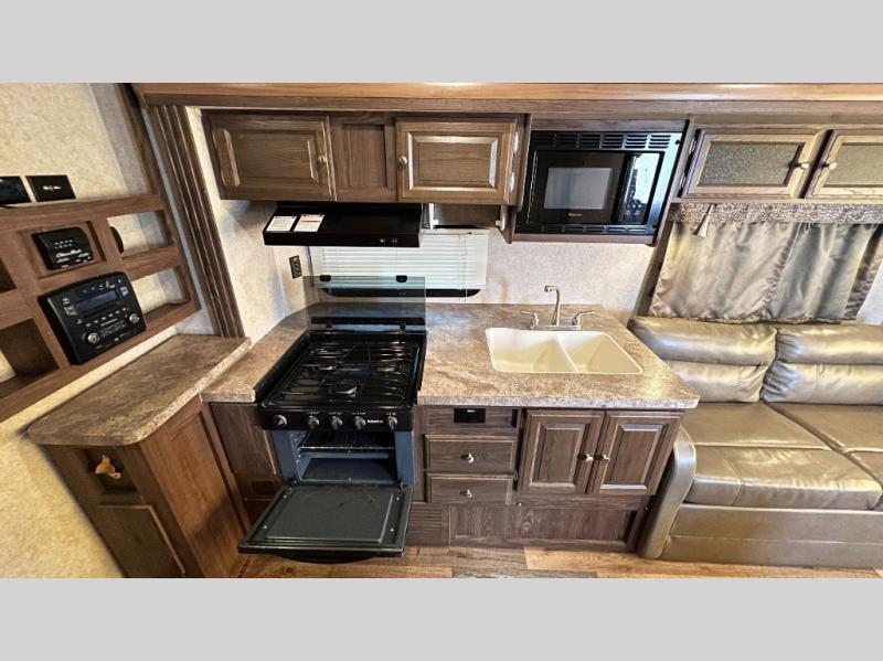 Along the curb side is a 64" sofa with overhead cabinets beside a double kitchen sink, three burner range, microwave, and additional storage above. Next to the slide is an entertainment center.