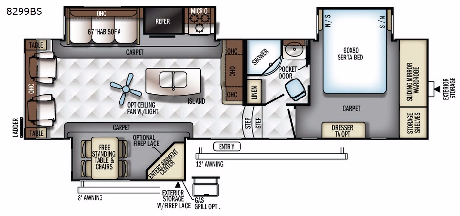 There is also plenty of storage for your outdoor gear with the exterior pass through compartment, plus front and entertainment slide out storage areas outside as well. You also have the option of adding a gas grill, plus so much more!