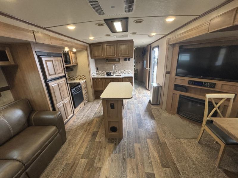 As you enter the travel trailer, to your left there is a slide out corner entertainment center with a fireplace option, plus a free-standing table and chairs. Along the rear wall you will find two recliners, and end tables. You can even choose optional Lazy Boy chairs in place of the standard recliners. The road slide has a hide-a-bed sofa, refrigerator, and three burner range with microwave above. Next to the slide there is extra counter space and a double sink. The kitchen island also provides additional counter space and two bar stools.