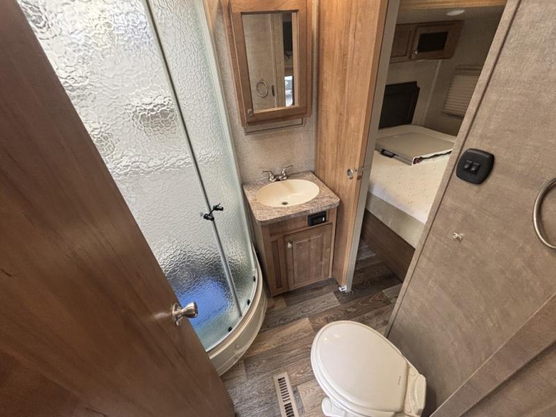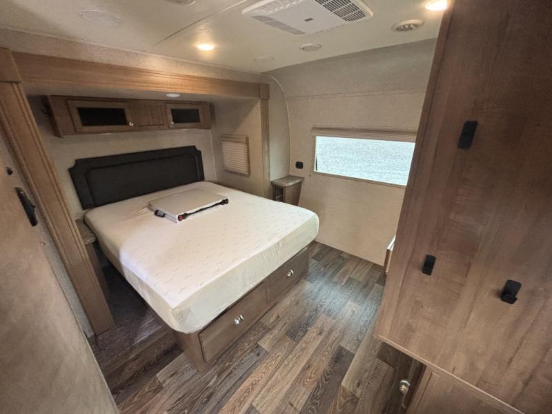 The front bedroom has a slide out queen bed with flip storage, and nightstands. Across from the bed there is a large wardrobe. If you like, you can choose to add the optional TV which would be located next to the wardrobe. You will be able to enjoy some natural light provided by the windshield in front.