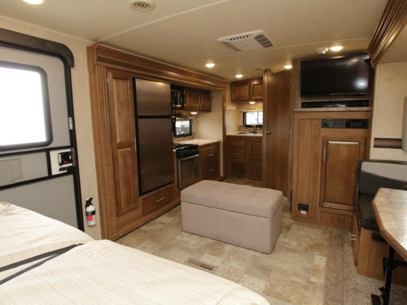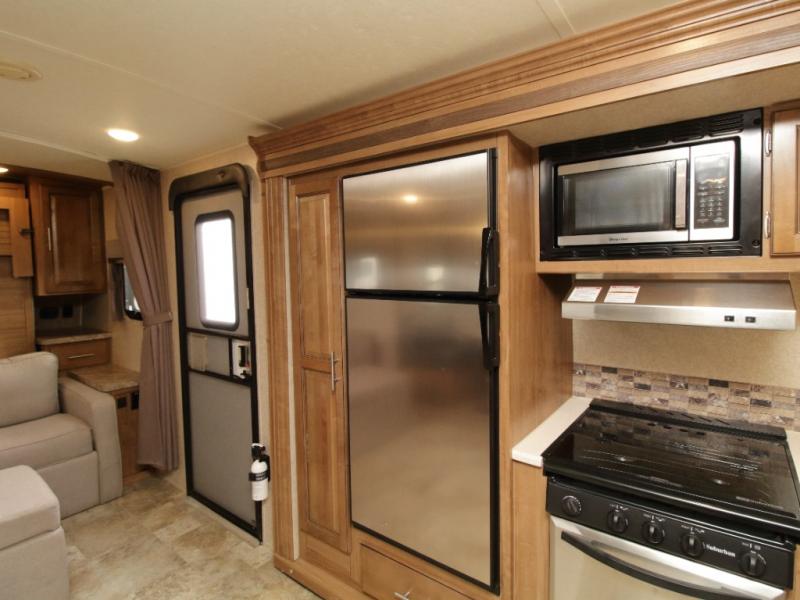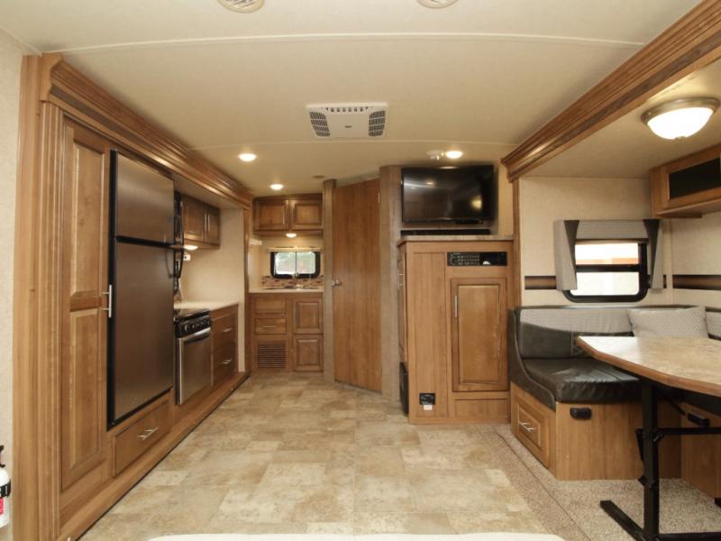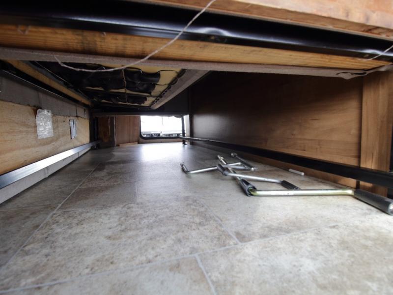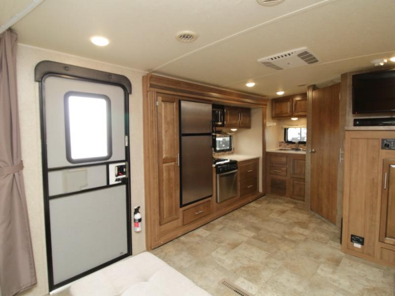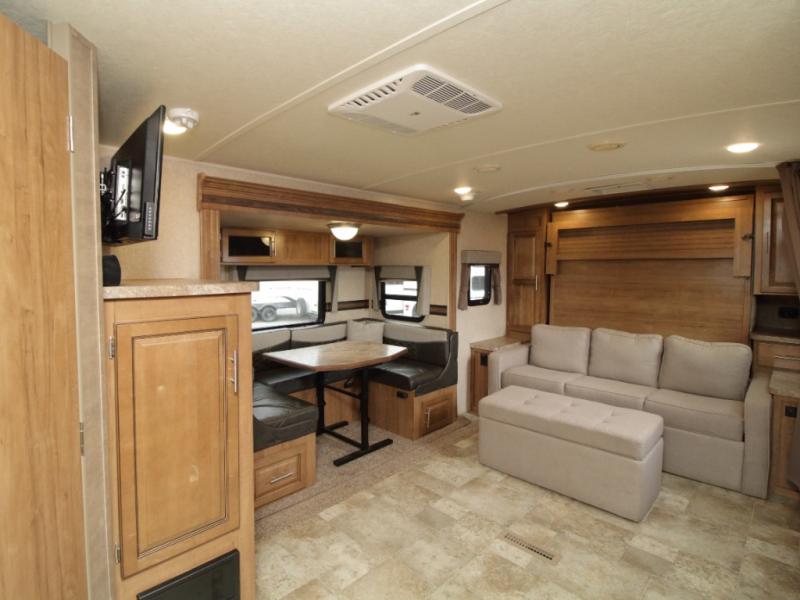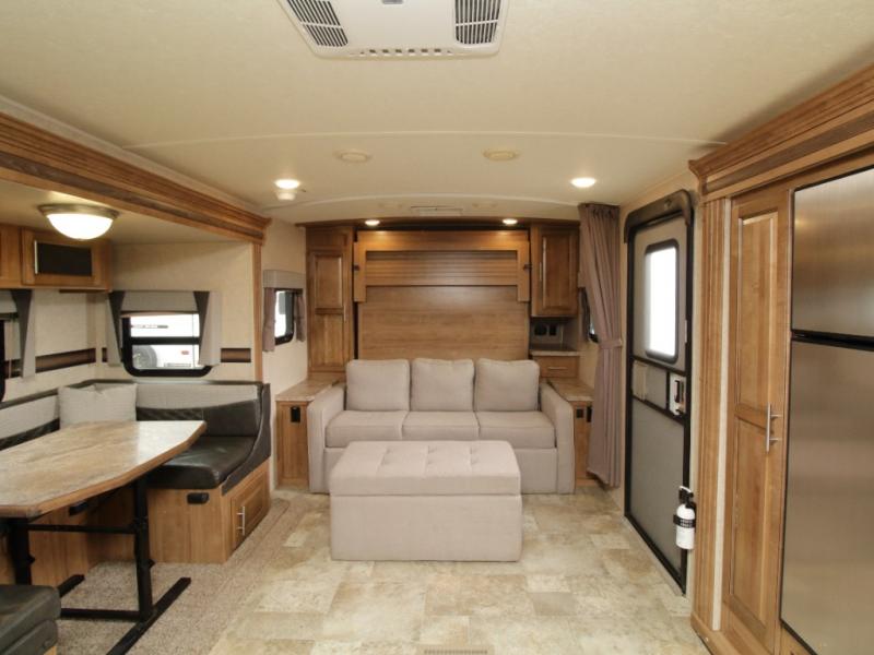 The dual opposing slides open up the center of the trailer to create a large, open living and kitchen space.