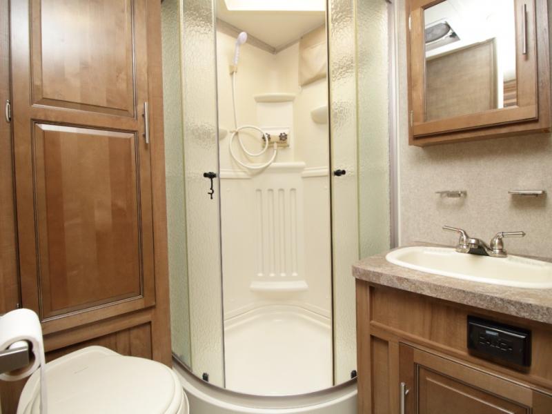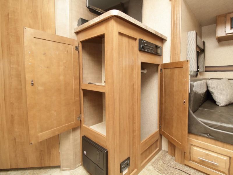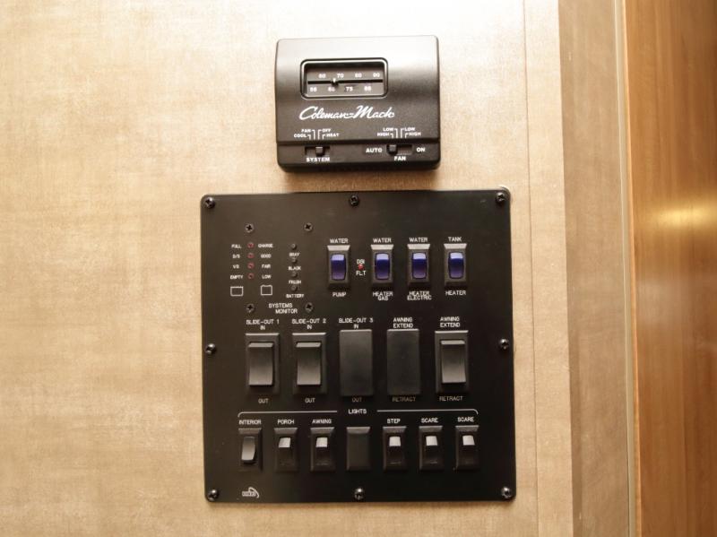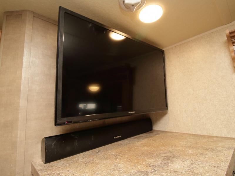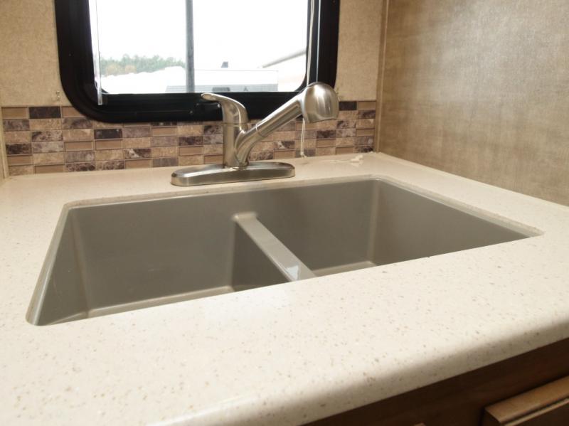A double kitchen sink sits just off the slide, and an entertainment center with TV is perfectly positioned for easy viewing.