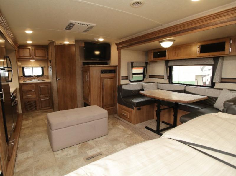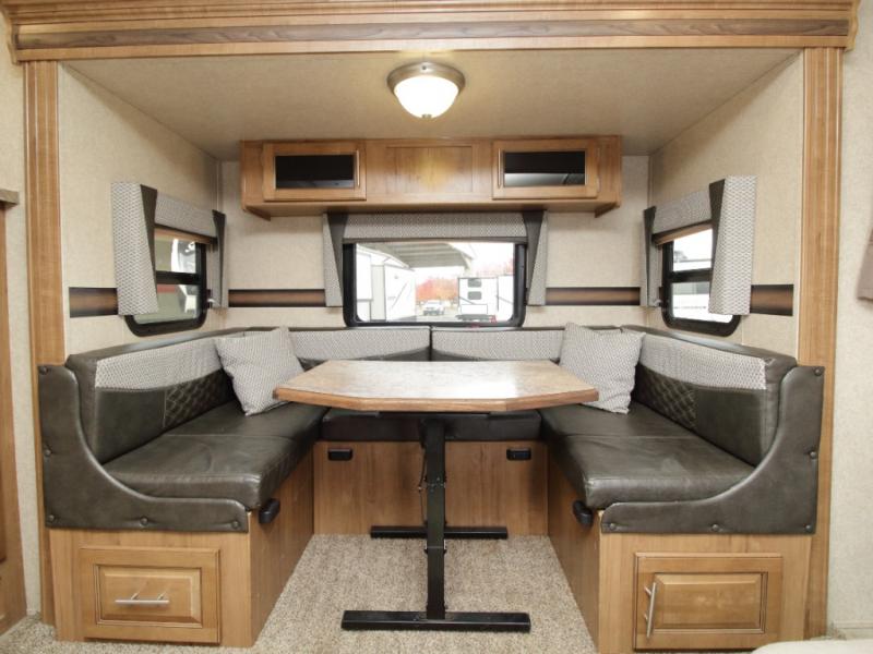 The roadside slide holds a spacious U-shaped dinette with overhead cabinets—ideal for meals, games, or additional sleeping space.