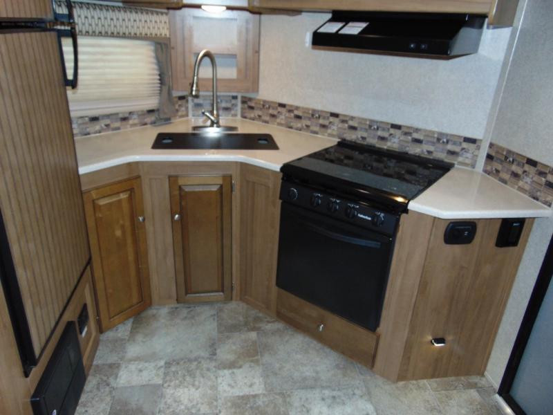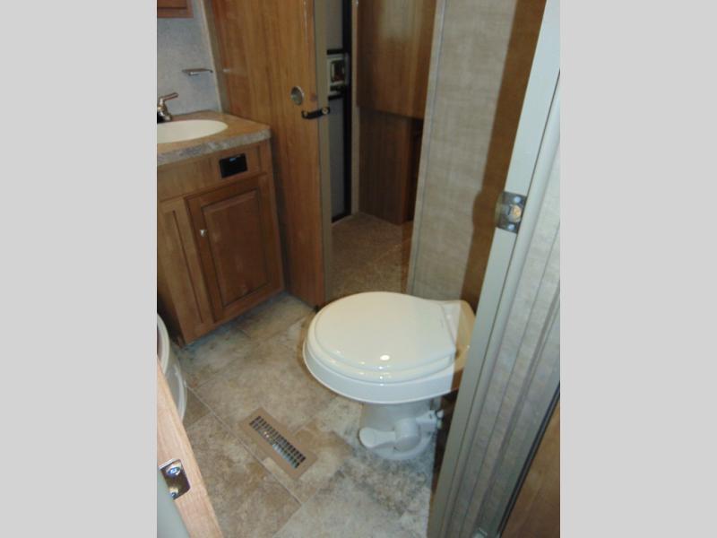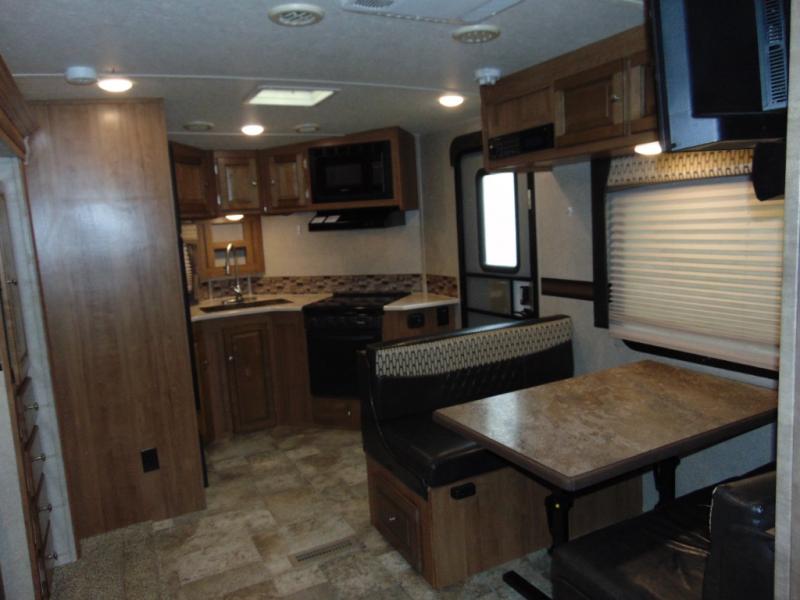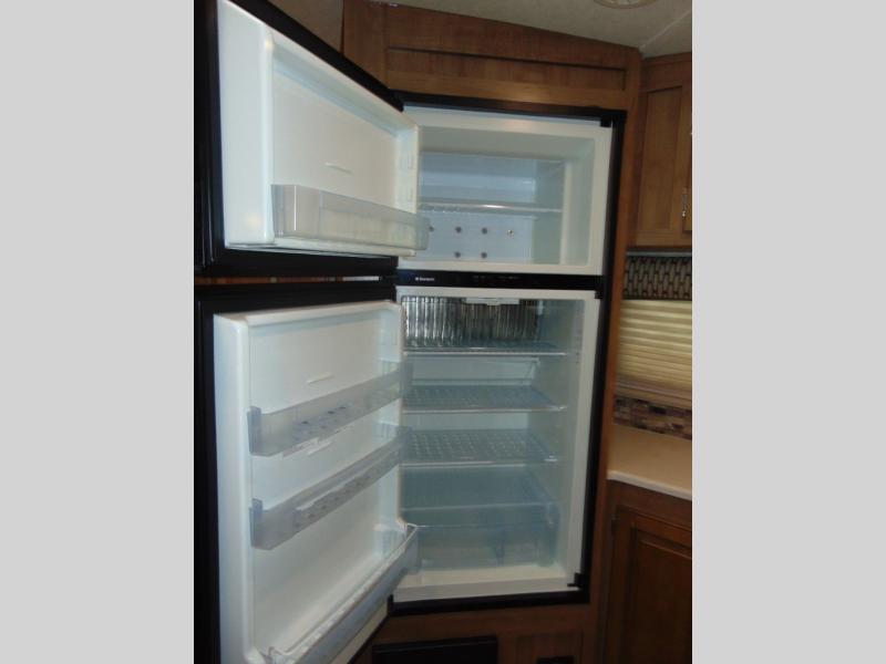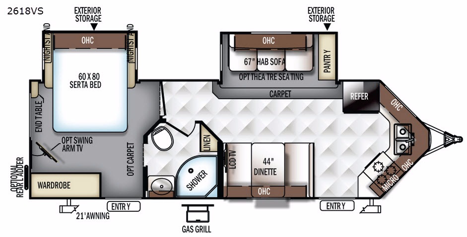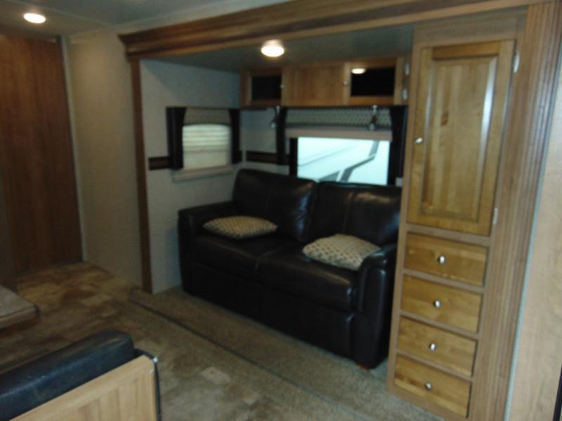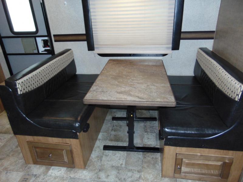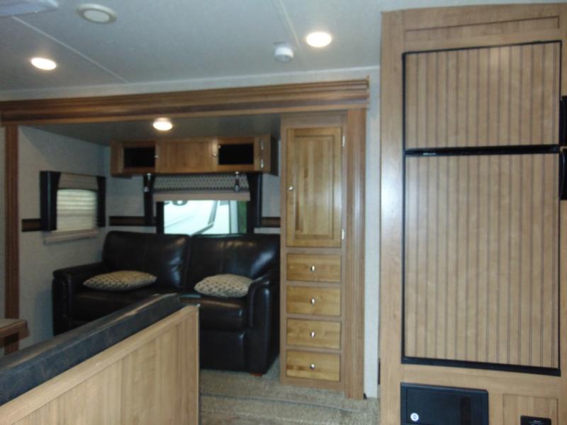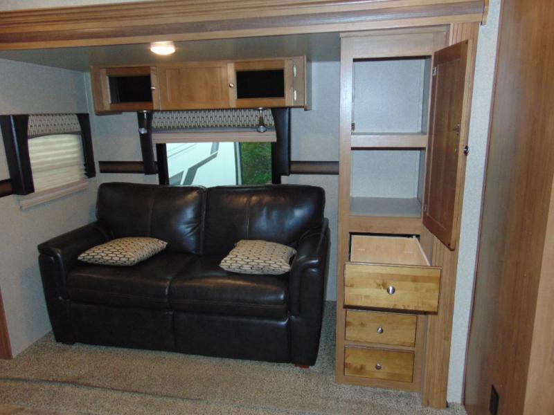 As you step inside the main entrance of the trailer, along the front you will find the kitchen with a three burner range, a microwave oven, and double sink. There are also overhead cabinets, and a refrigerator. The slide along the road side has a pantry and hide-a-bed sofa or choose optional theatre seating, both seating options include overhead cabinets. Across from the slide out there is a dinette with an overhead LCD TV and more cabinets for your things as well.