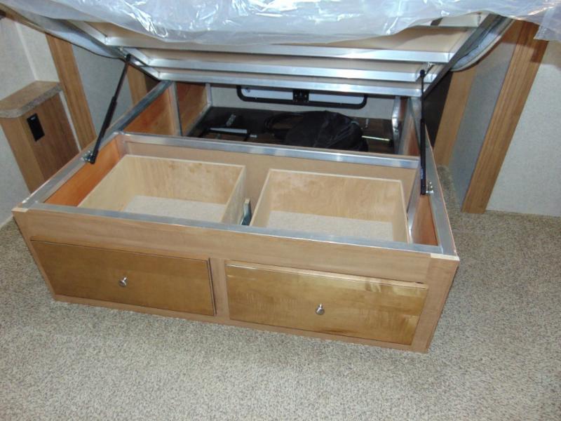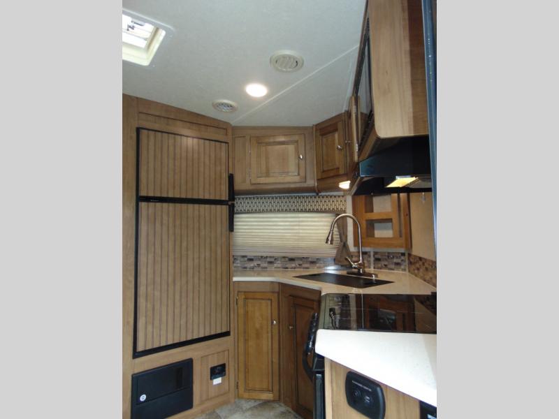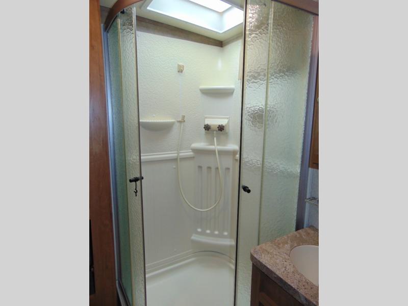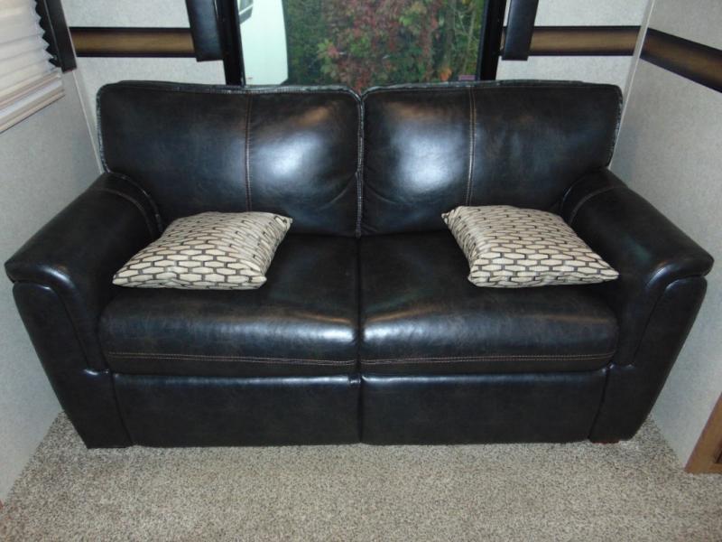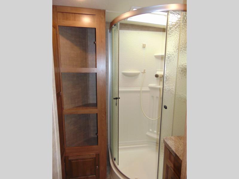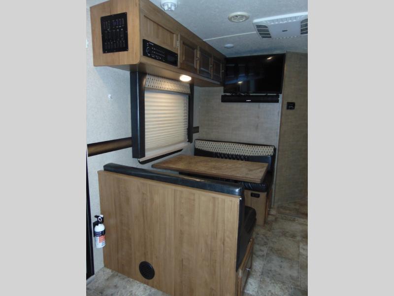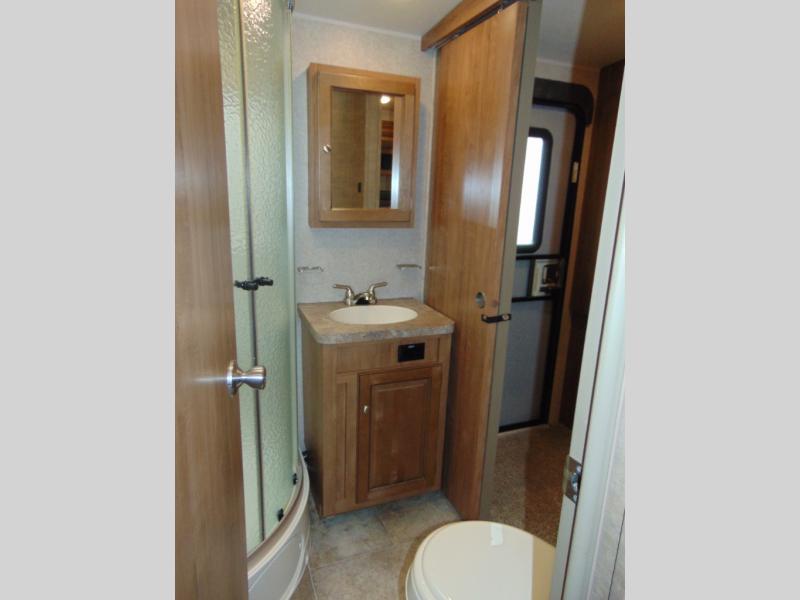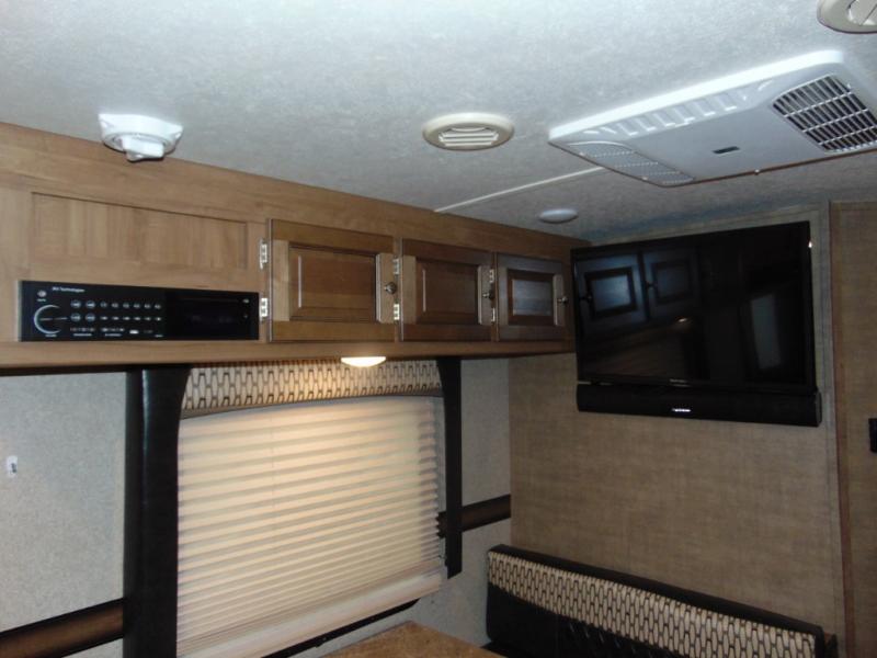 As you step inside the main entrance of the trailer, along the front you will find the kitchen with a three burner range, a microwave oven, and double sink. There are also overhead cabinets, and a refrigerator. The slide along the road side has a pantry and hide-a-bed sofa or choose optional theatre seating, both seating options include overhead cabinets. Across from the slide out there is a dinette with an overhead LCD TV and more cabinets for your things as well.