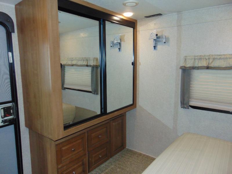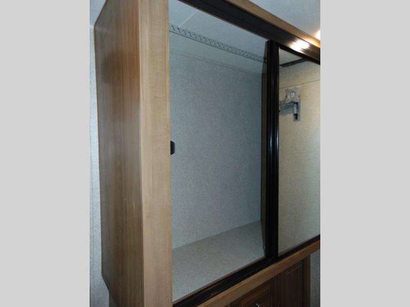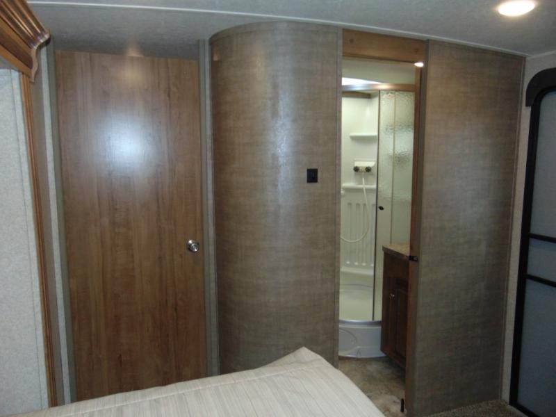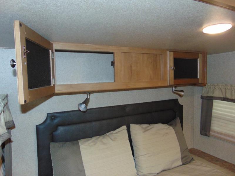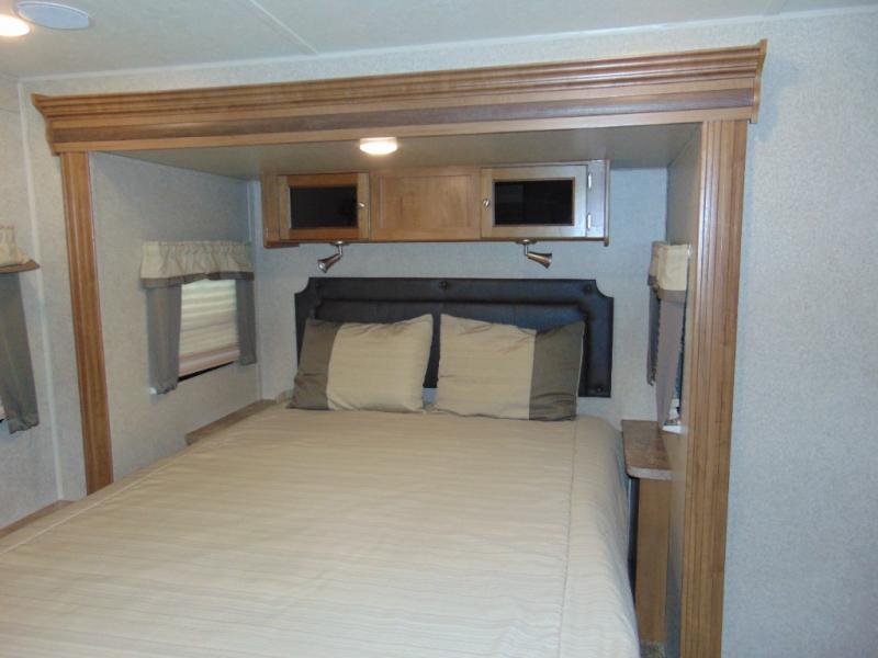 In the rear bedroom the slide helps to open up the floor space. The queen Serta bed, nightstands, and overhead cabinets are located along the road side slide. Across from the bed you will find a large wardrobe, and along the wall you can choose to add an optional swing arm TV. There is also a private entrance door leading outside from the bedroom.