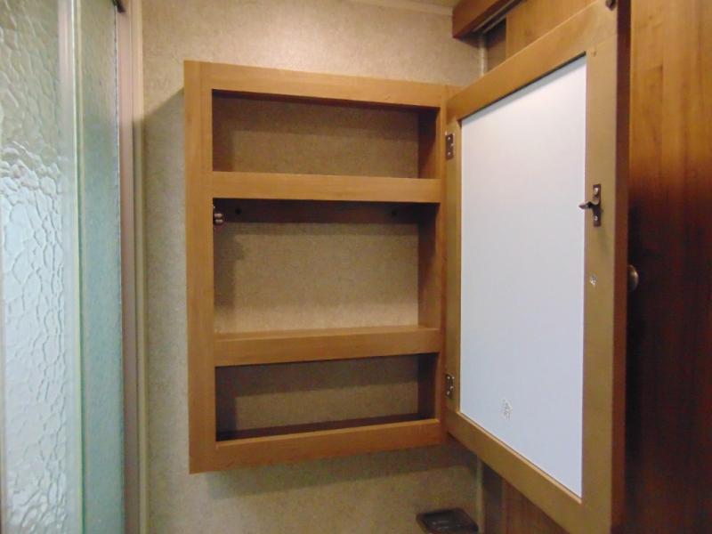 The side aisle bath includes a linen cabinet for towels, a radius shower, a sink with overhead medicine cabinet, and toilet. There is also a private entrance from the bathroom into the bedroom through a sliding pocket door.