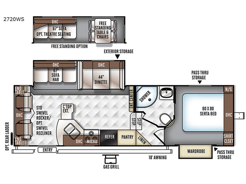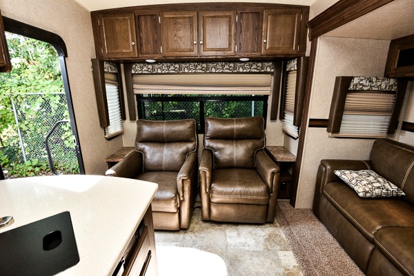 As you step in this fifth wheel you will see two swivel rockers with end tables and overhead storage along the rear. You can choose optional swivel recliners if you like. Straight inside the door there is a slide out hide-a-bed sofa, booth dinette, and overhead storage above both. You may choose a free standing option which provides a sofa or optional theatre seating with the table and chairs. An entertainment center is located along the interior wall facing the rear of the unit for easy viewing.