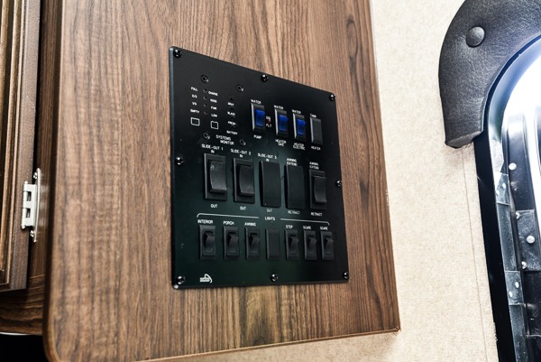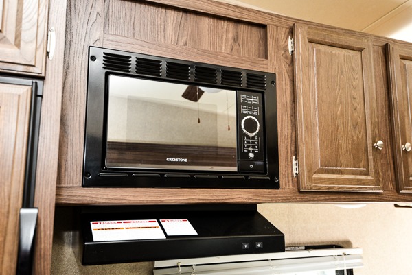 Along the curb side you will find all your kitchen amenities. There is a double sink on an angled countertop including a counter extension if you need more prep space. Continuing along the wall there is a three burner range, microwave, refrigerator, and a pantry.