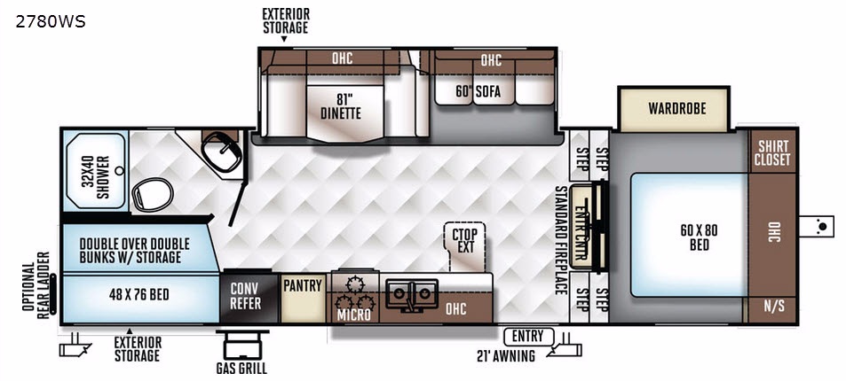 Outside enjoy plenty of exterior compartments for your outdoor gear, a gas grill for cooking outside, and the shade provided by a 21' awning, and an optional rear ladder, plus more!