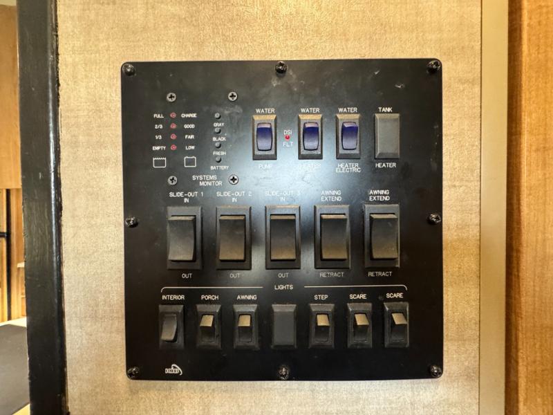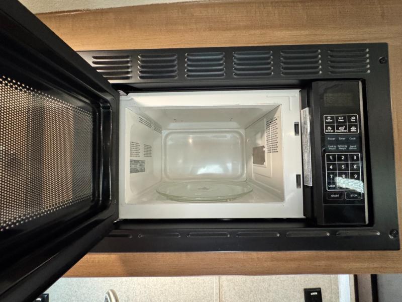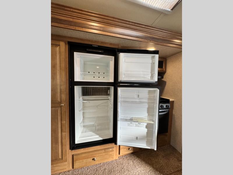 Kitchen: Equipped with solid-surface countertops, a double-door refrigerator, microwave, oven, and pantry. The dinette slide-out expands the central living space.