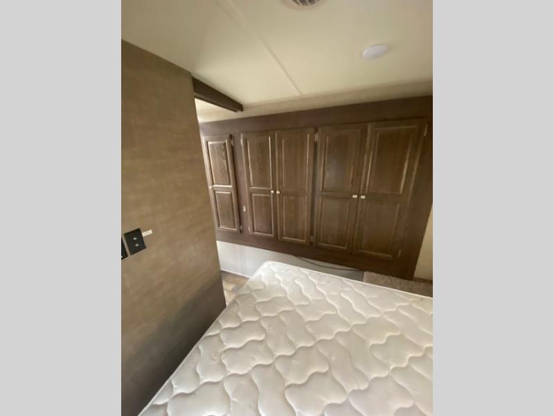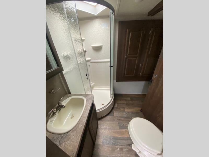 A side aisle bath includes a toilet, sink, radius shower, linen cabinet within the bedroom slide out, and a sliding entrance door into the bedroom. Plus the main entry into the trailer is almost directly across from the bath entrance.