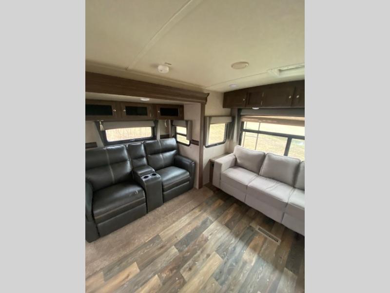 Step inside model 2906WS to your left to find a slide out including a booth dinette, and theater seating or choose optional swivel chairs instead. You may also choose a free standing table with chairs in place of the dinette. Along the rear wall there is a hide-a-bed sofa with two end tables and overhead cabinets. The second slide in this space includes an entertainment center with optional fireplace below, pantry, refrigerator, three burner range, microwave, plus overhead cabinets. A double kitchen sink, counter space for preparing meals including countertop extension, and overhead cabinets complete the kitchen along the interior wall.