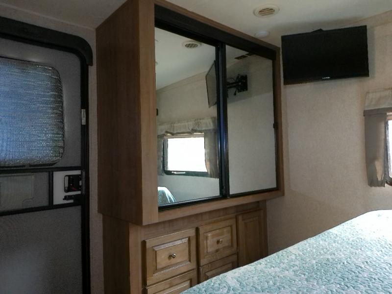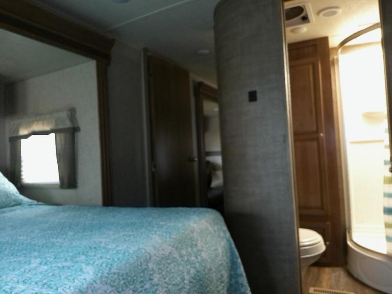 In the rear bedroom the slide helps to open up the floor space. The queen Serta bed, nightstands, and overhead cabinets are located along the road side slide. Across from the bed you will find a large wardrobe, and along the wall you can choose to add an optional swing arm TV. There is also a private entrance door leading outside from the bedroom.