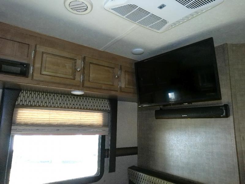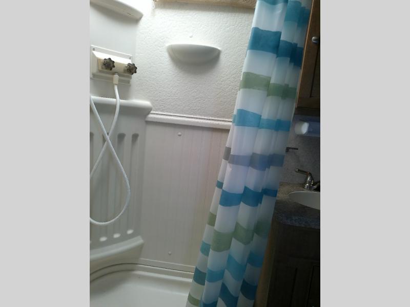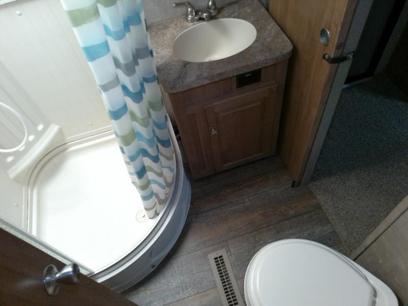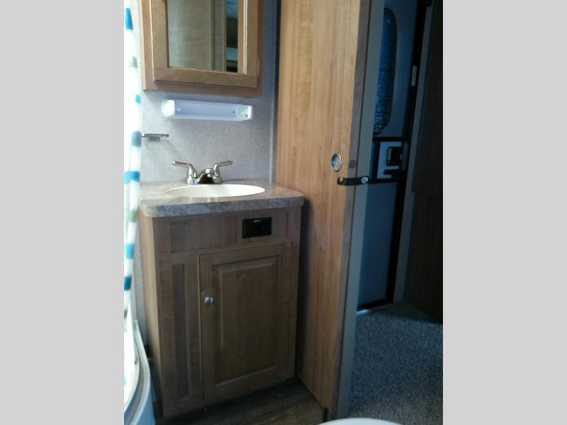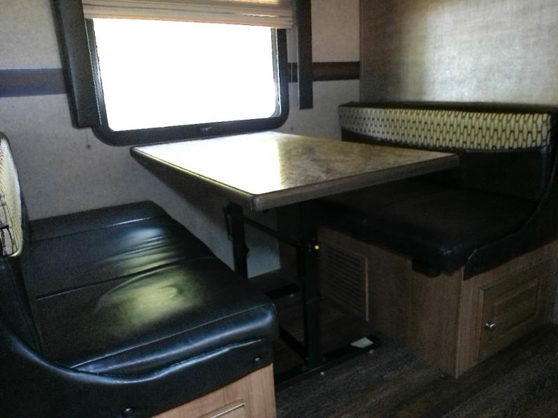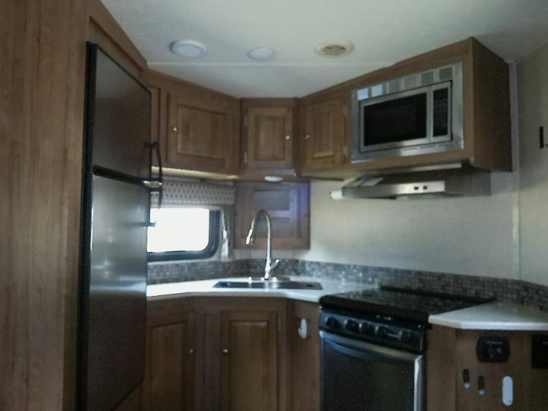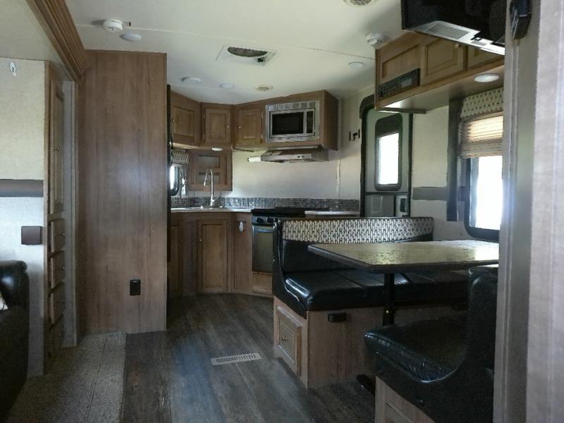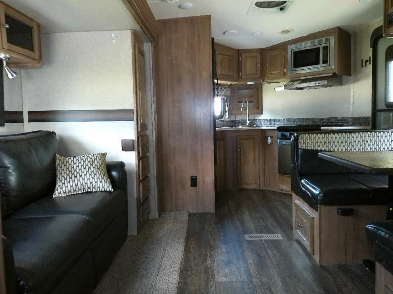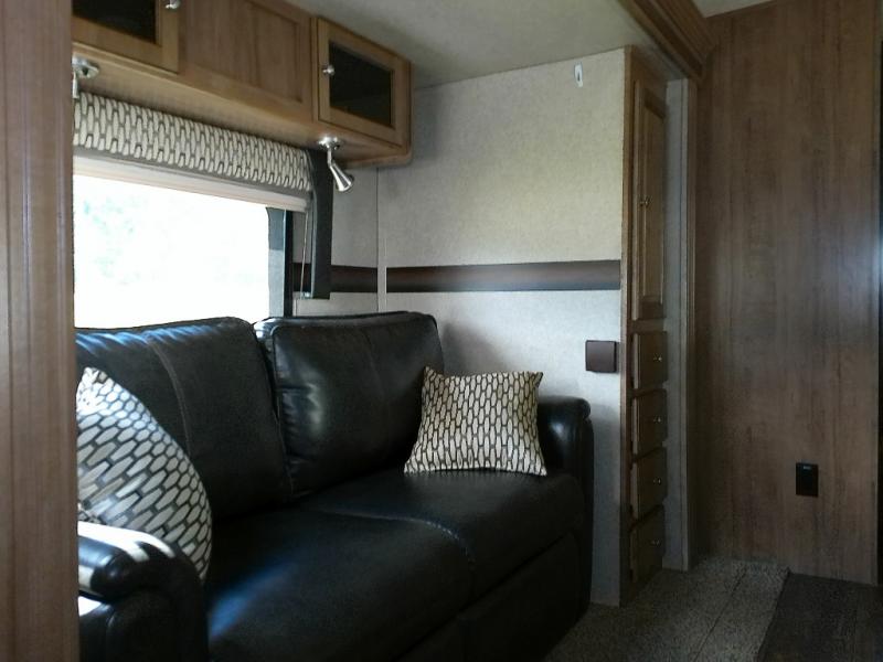As you step inside the main entrance of the trailer, along the front you will find the kitchen with a three burner range, a microwave oven, and double sink. There are also overhead cabinets, and a refrigerator. The slide along the road side has a pantry and hide-a-bed sofa or choose optional theatre seating, both seating options include overhead cabinets. Across from the slide out there is a dinette with an overhead LCD TV and more cabinets for your things as well.