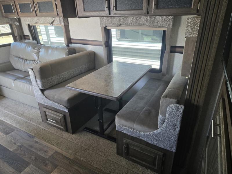 A road side slide out includes a hide-a-bed sofa and a dinette, or in place of the sofa and dinette you can choose the free standing table with chairs option. This option also includes a sofa or theatre seating, plus a free standing table and chairs. You may also choose theater seating in place of the sofa and keep the dinette. Adjacent to the slide out there is an entertainment center for easy viewing in this combined space.
