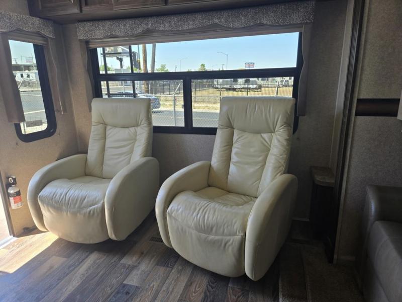 Along the rear wall by the main entrance there are two swivel rockers, two end tables, and overhead cabinets for storage. You can choose optional recliners if you wish.
