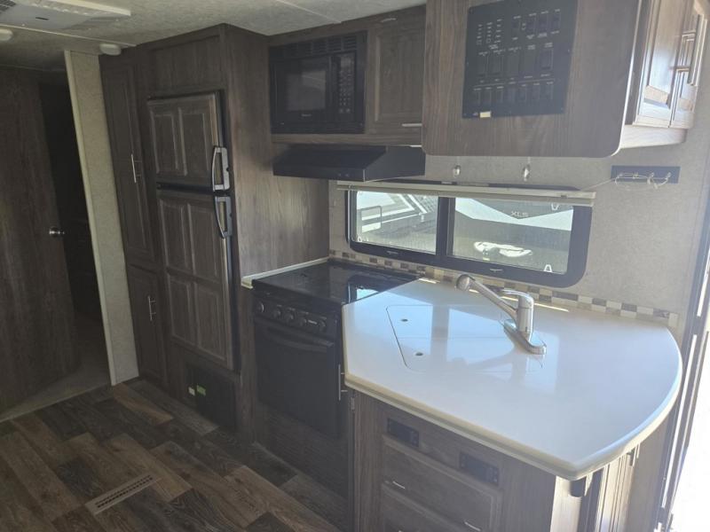 Along the curb side wall, the kitchen area has an angled countertop with a double sink, a countertop extension, and overhead cabinets for storage. You will enjoy cooking up light meals and snacks using the three burner range and microwave oven while the refrigerator and pantry allow for plenty of food storage for any trip.