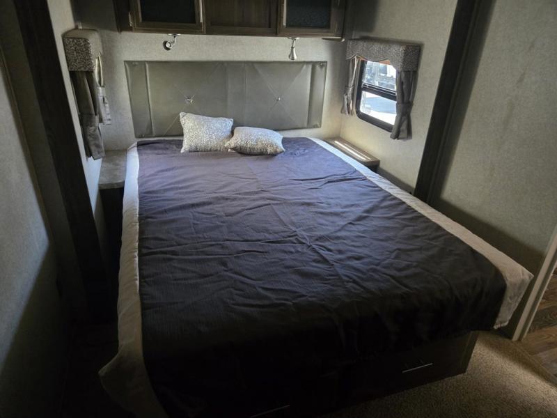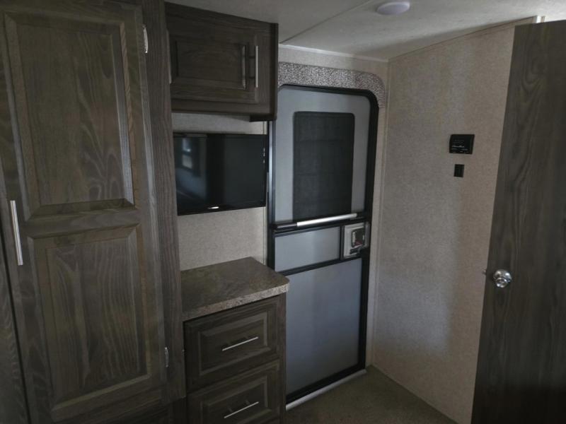 In the walk through bedroom you will find a slide with a queen Serta bed and a nightstand on either side of the bed. On the opposite side, a wardrobe and a TV option are next to the second entry into the trailer.