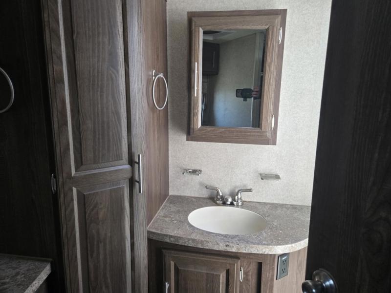 The front bathroom is located in the very front of the trailer. Inside the bathroom there is a toilet, HIS and HER sinks with medicine cabinets overhead, linen storage, and a radius shower.