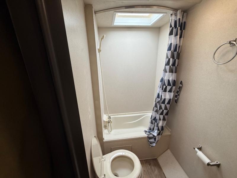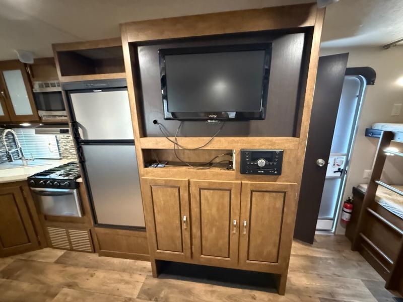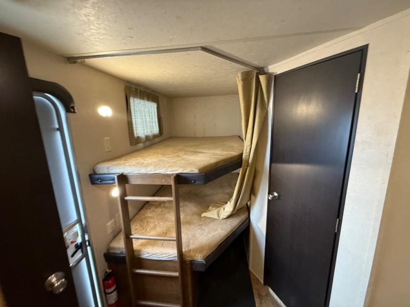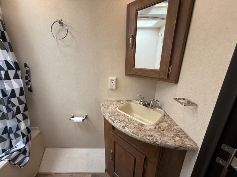 Enter inside this model, and along the rear left corner there is a set of bunk beds with a ladder which allows for easy access to the top bunk. The opposite corner of the trailer features a bathroom with a sink & medicine cabinet, shower/tub, and a toilet.
