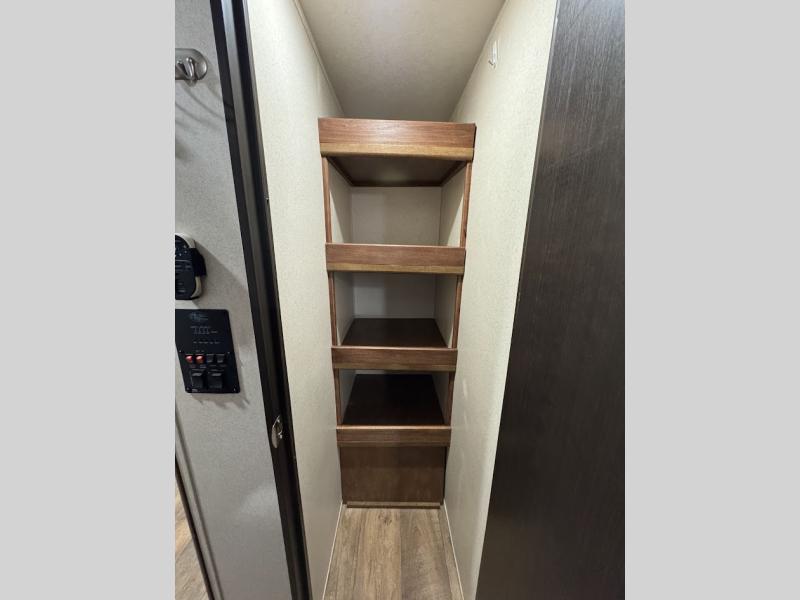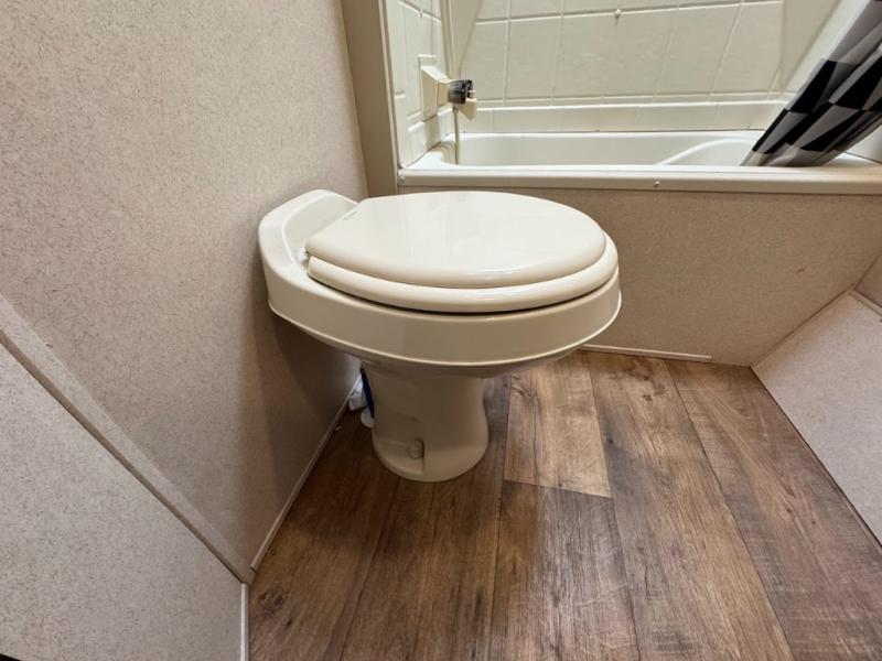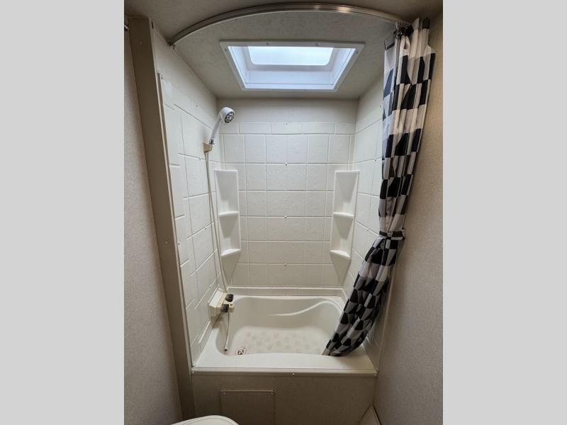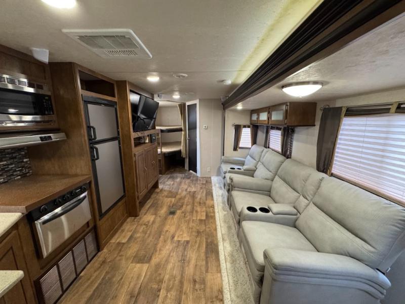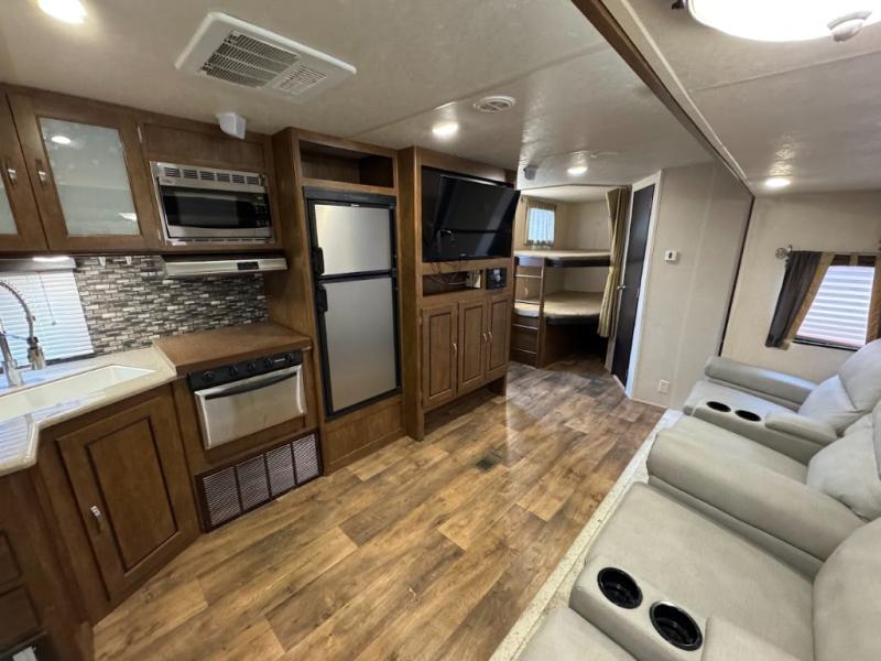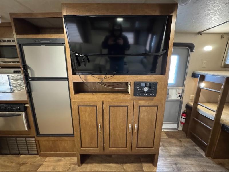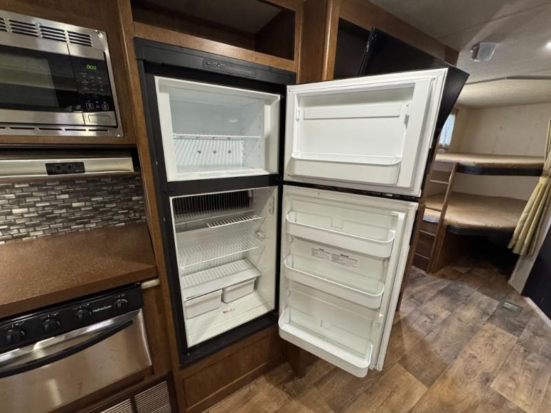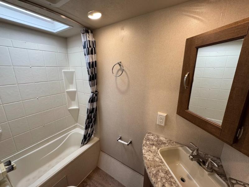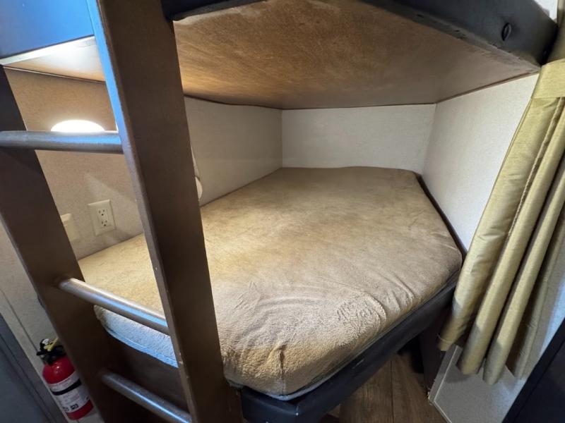 Enter inside this model, and along the rear left corner there is a set of bunk beds with a ladder which allows for easy access to the top bunk. The opposite corner of the trailer features a bathroom with a sink & medicine cabinet, shower/tub, and a toilet.