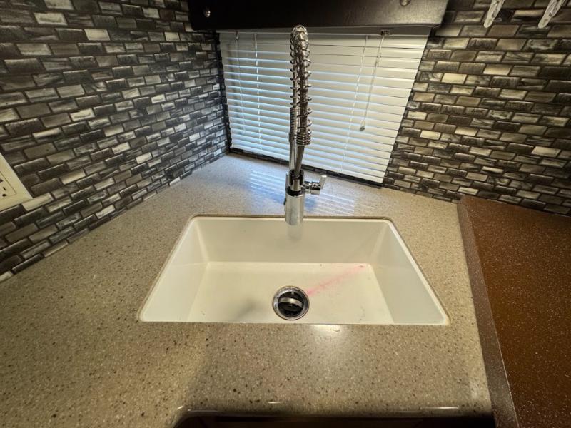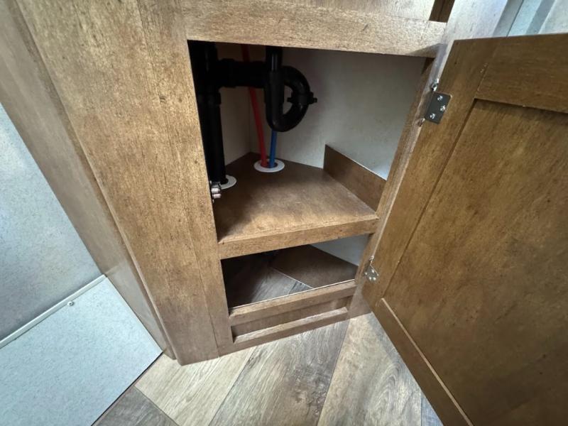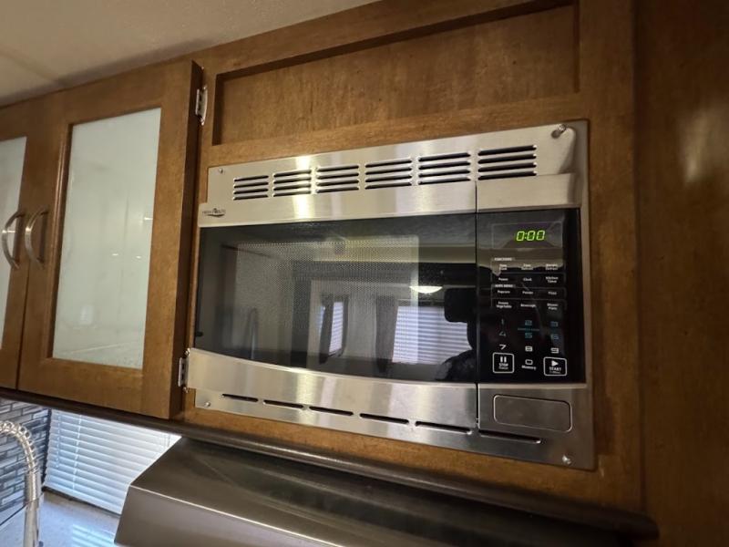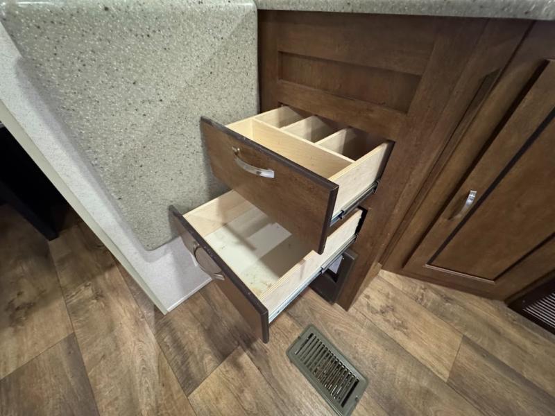 The combined living and kitchen area feature a single slide out which helps to open up the floor space. Along the slide out there is a sofa and an overhead cabinet, plus a u-shaped dinette. Both the sofa and dinette offer great seating options, and at night you can use these areas for additional sleeping space. Along the door side there is a large pantry, an entertainment center, a refrigerator, a three burner range, overhead microwave, and an angled double sink with overhead cabinets. If you need just a bit more counter space, then easily make use of the flip-up counter.