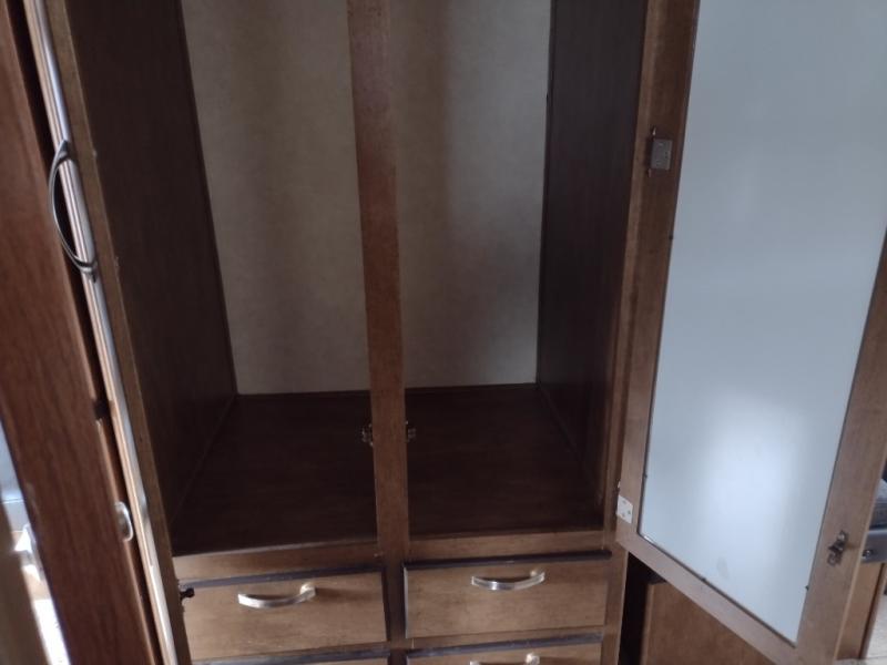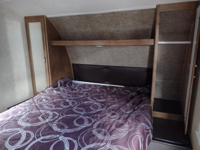 In the front bedroom you will find a RV queen bed with dual wardrobes and an overhead shelf, plus sliding doors for privacy.