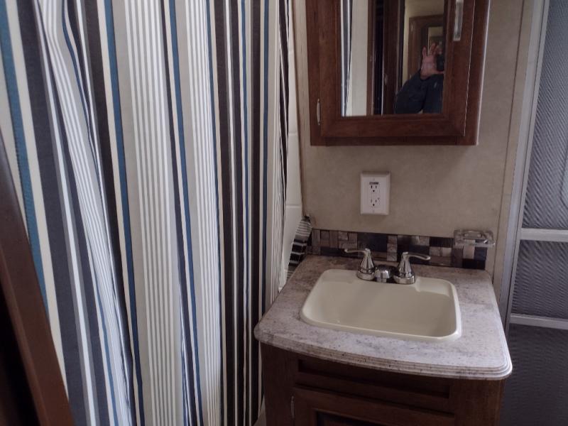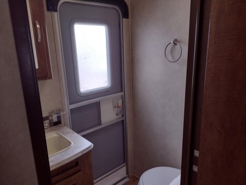 Proceeding towards the rear of the travel trailer, the bathroom is on the left. Inside the bathroom there is a shower/tub, sink, medicine cabinet, and toilet. You will also find a private entrance from outside into the bathroom.