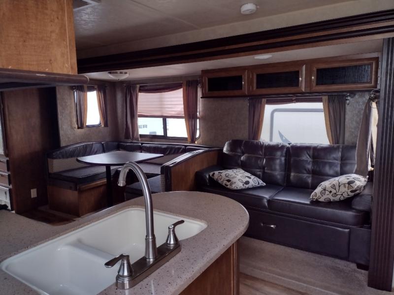 As you enter the travel trailer, to the left there is a l-shaped counter top with a double kitchen sink, three burner range, microwave, refrigerator, and a pantry. The opposite side includes a slide with a sofa and u-dinette. Along the front of the living/kitchen area there is an entertainment center for your enjoyment.
