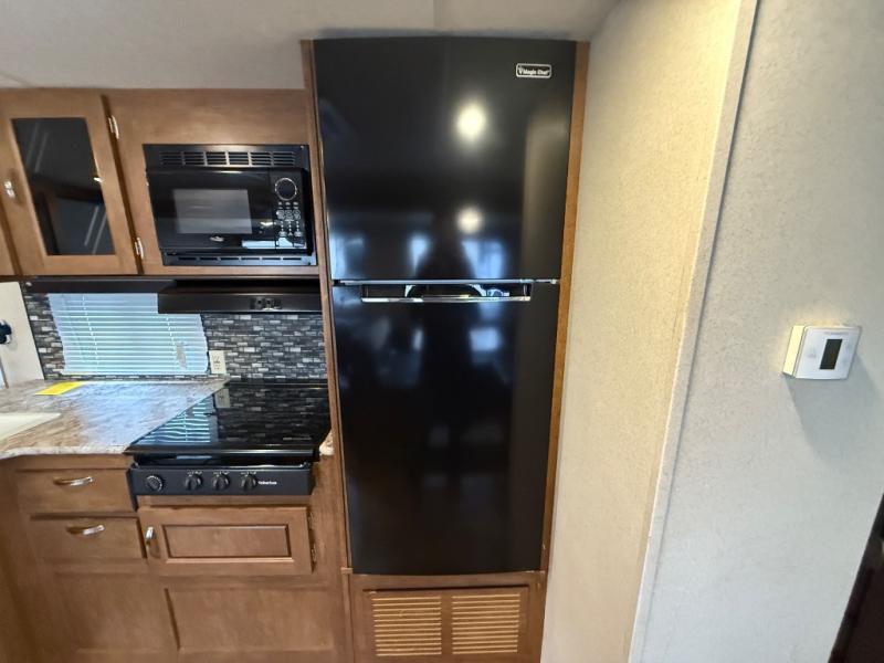 As you enter this model, to the left you will find a double kitchen sink, overhead cabinet, three burner range, microwave, and refrigerator. On the opposite side there is a slide with a sofa and a u-dinette. Adjacent to the slide find a pantry.