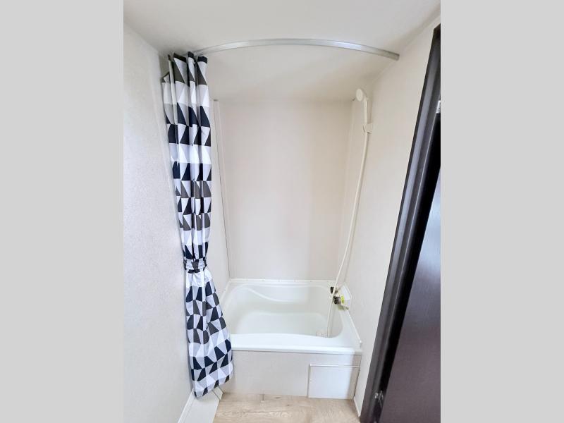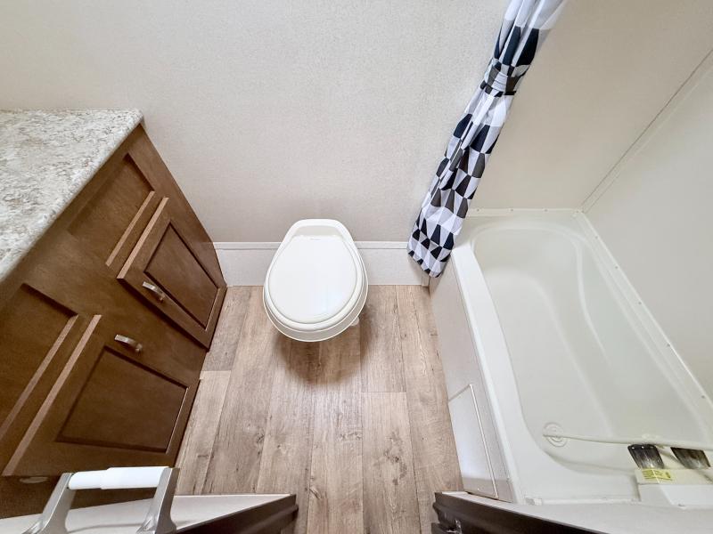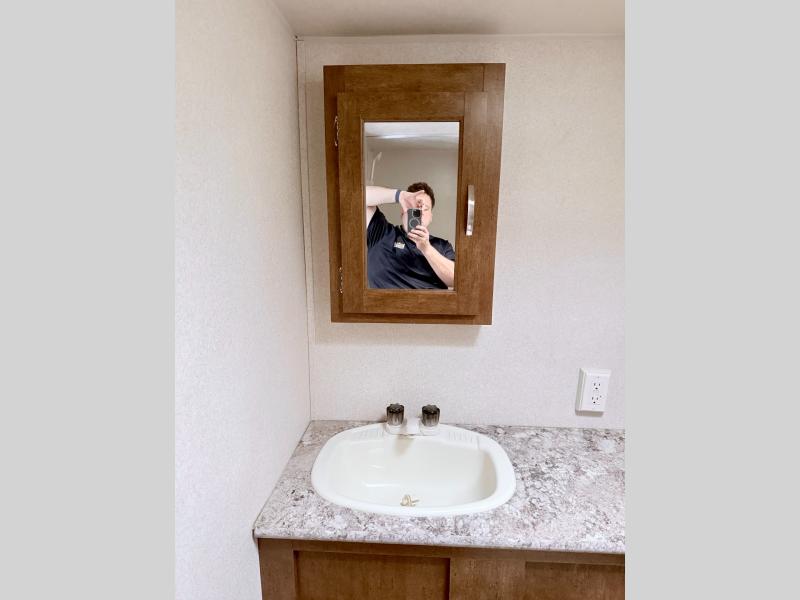 The bathroom is located in the rear of the trailer. Here you will find a toilet, a tub/shower, and a sink with a medicine cabinet above.